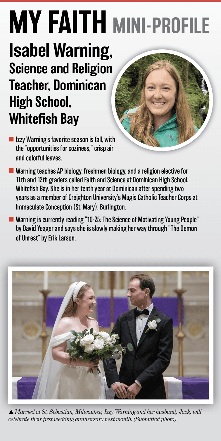 Warning teaches AP biology, freshmen biology, and a religion elective for 11th and 12th graders called Faith and Science at Dominican High School, Whitefish Bay. She is in her tenth year after spending two years as a member of Creighton University’s Magis Catholic Teacher Corps.