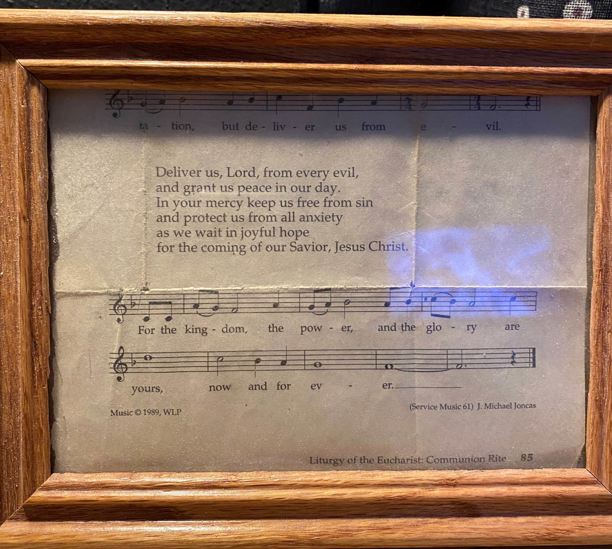 He took a page of an old missalette with these words, torn and folded to fit nicely into his wallet, which he carried for nearly 20 years, and handed it to me, reminding me that God does not want the brokenness of anxiety for me. This page now sits in a frame in my bedroom. Each time I hear these words before the exchange of peace, I think of both my fathers — the heavenly one and the earthly one — and their immense love for me.