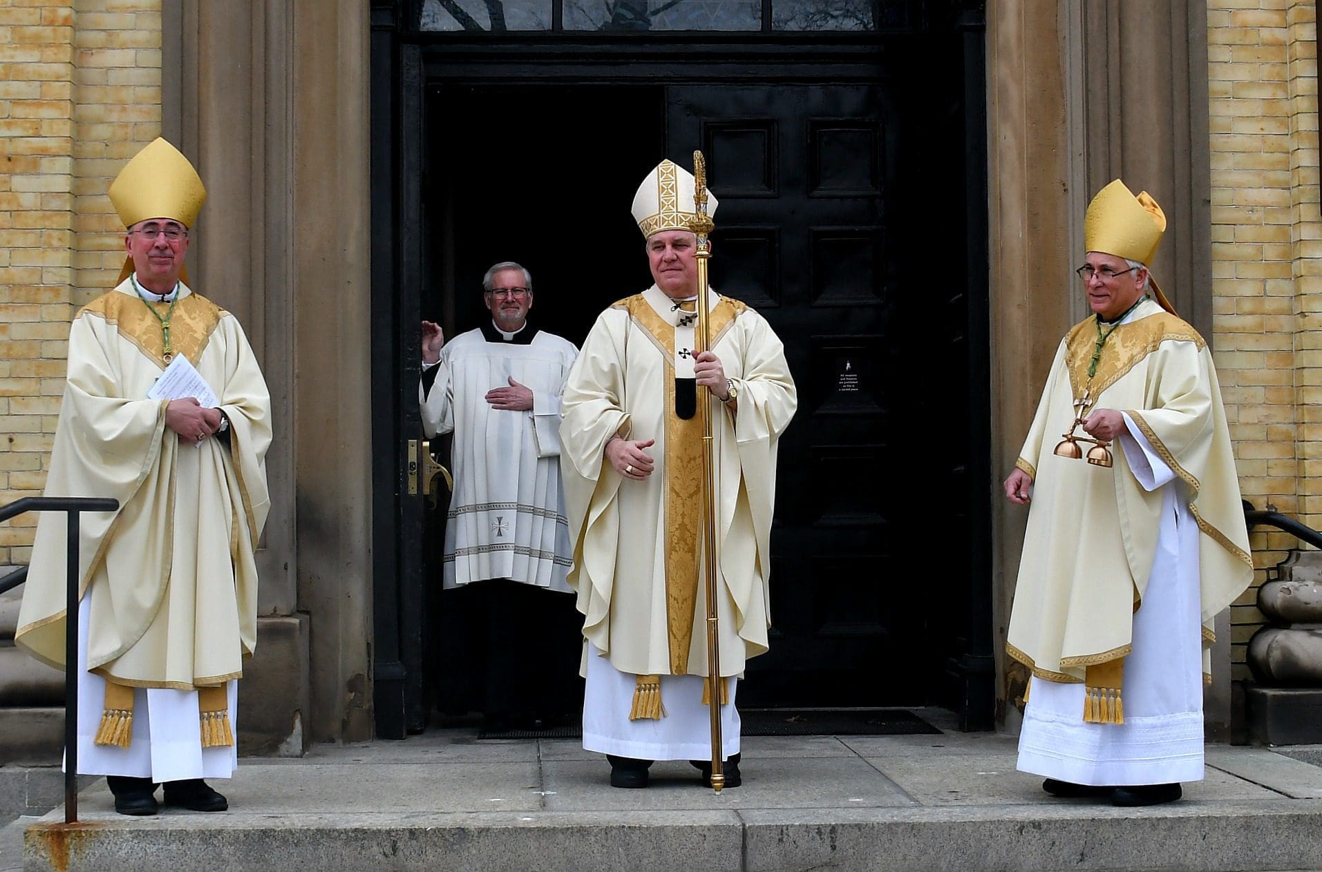 Archbishop Jerome E. Listecki with Bishop James T. Schuerman (left) and Bishop Jeffrey R. Haines (right) on Easter 2020 at the Cathedral of St. John the Evangelist. (Photo by David Bernacchi)