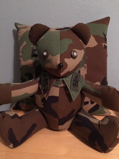The toughest bear Thomas has sewn was one made from a U.S. Navy fatigue shirt.