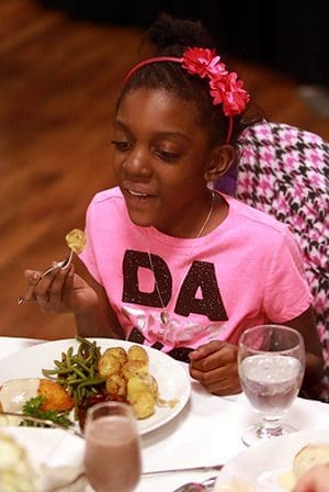 Eight-year-old Akylah Adams-Pope enjoys dining at Marquette University High School, Milaukee on Feb. 28, 2015. Thanks to the generosity of a new charitable initiative, North Star Providers, guests were treated to a multi-course meal with music, flowers and comedy. (Catholic Herald photo by Allen Fredrickson)