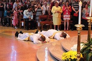 ■ The Archdiocese of Milwaukee filed a 399-page disclosure statement and plan for reorganization with the U.S. Frs. Dennis Saran, left, and Mauricio Fernandez Boscon lay prostrate before the altar at the Cathedral of St. John the Evangelist during their Mass of ordination to the priesthood, May 16, 2015. (Catholic Herald photo by Peter Fenelon)Bankruptcy Court for the Eastern District of Wisconsin on Aug. 24. It will be up to the court’s chief judge, Susan V. Kelley, to decide whether to approve the plan. A hearing on a comfirmation of the amended plan was set for Nov. 9.