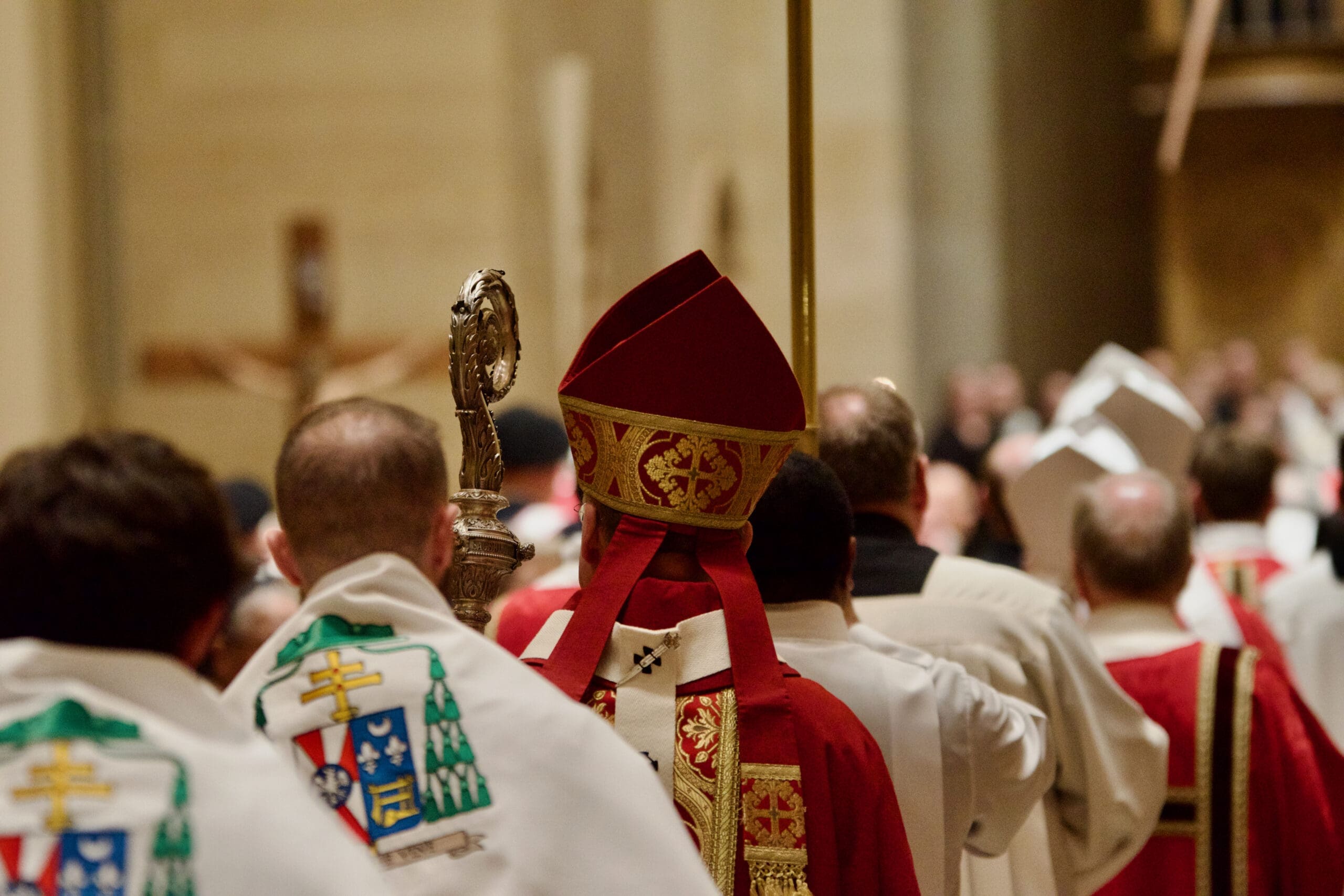 Archbishop Jeffrey S. Grob carries a crozier used by the Most Rev. Frederick Xavier Katzer, archbishop of Milwaukee from 1891 to 1903, at a Mass of Thanksgiving on Nov. 3 at the Cathedral of St. John the Evangelist, Milwaukee. (Photo by Sean Smith)
