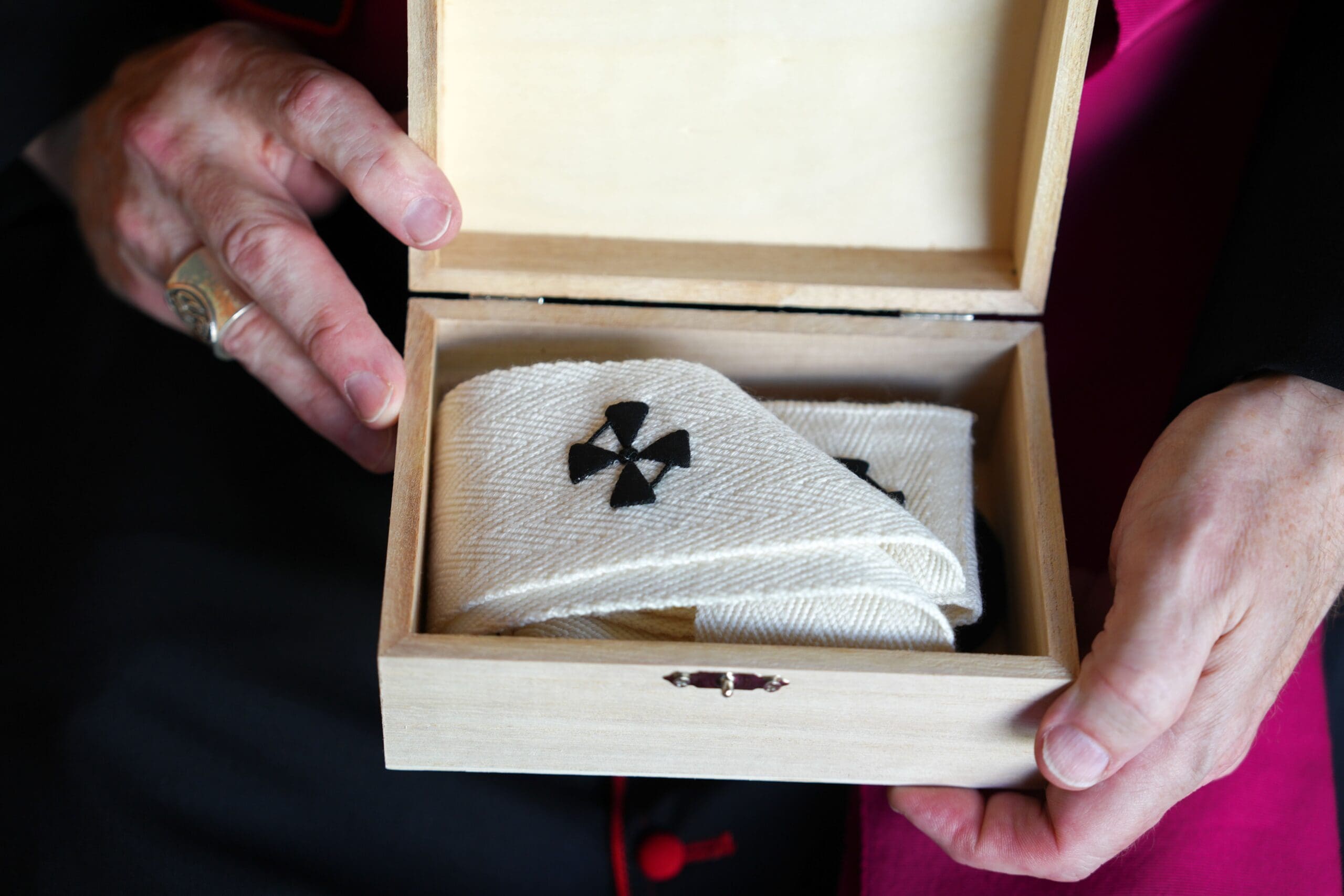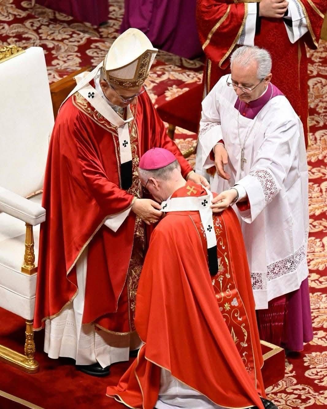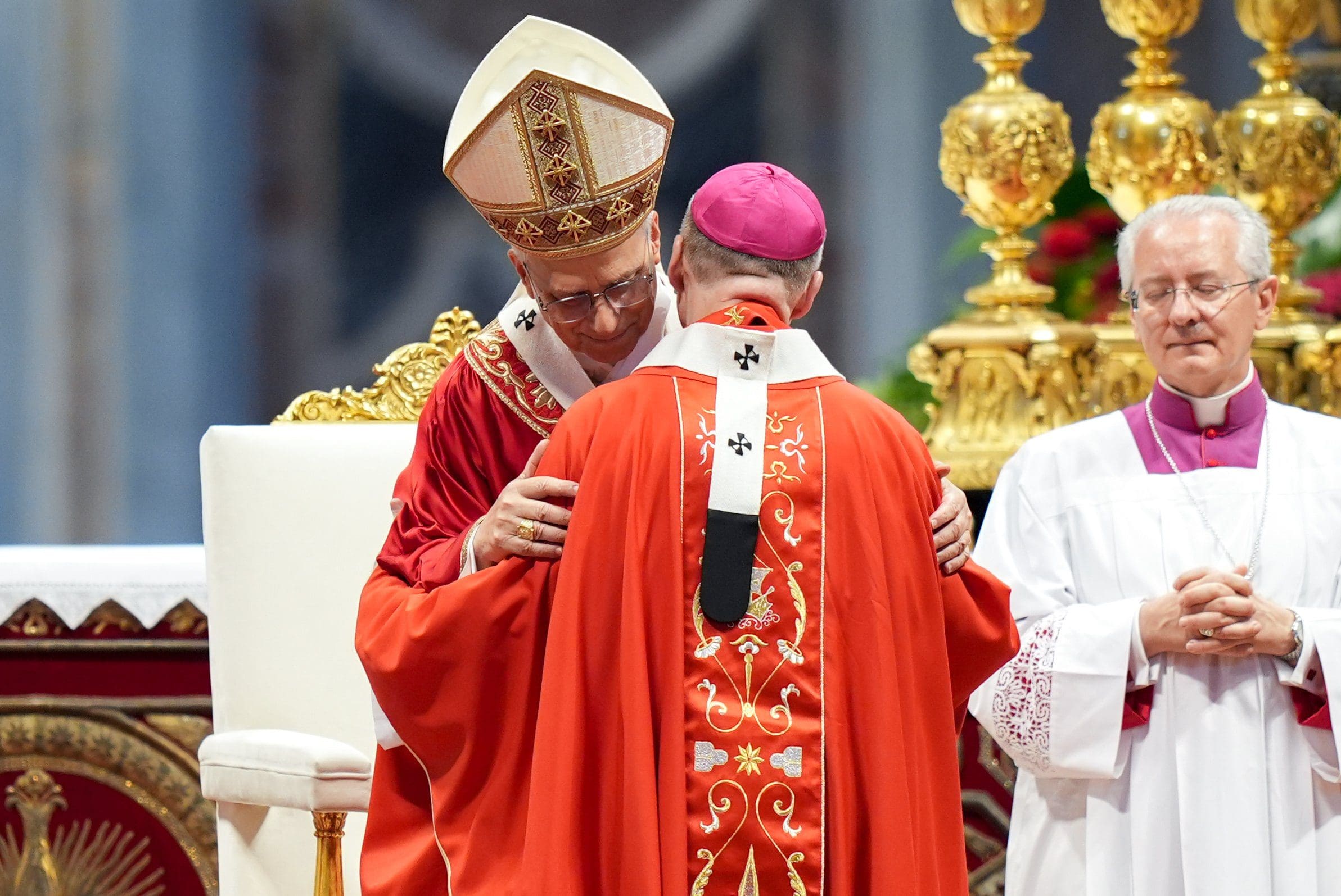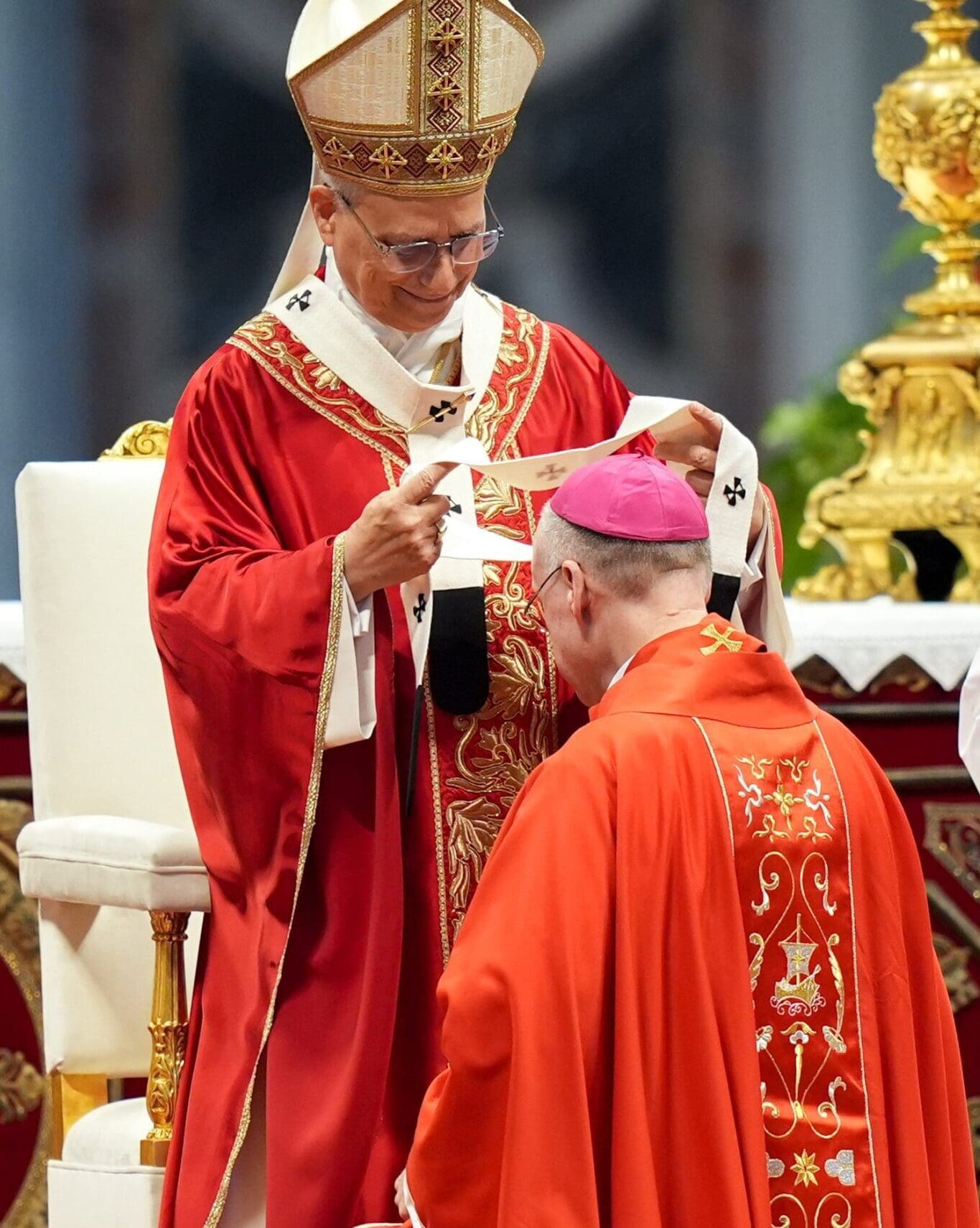 Archbishop Jeffrey S. Grob received his pallium — a white woolen vestment symbolizing pastoral authority and service to the people of God — from Pope Leo XIV on Sunday, June 29. Archbishop Grob was among 48 new metropolitan archbishops, including eight from the United States, to receive their pallium from the pope at a Mass on the Solemnity of Ss. Peter and Paul in St. Peter’s Basilica at the Vatican on June 29. (CNS photos/Lola Gomez)