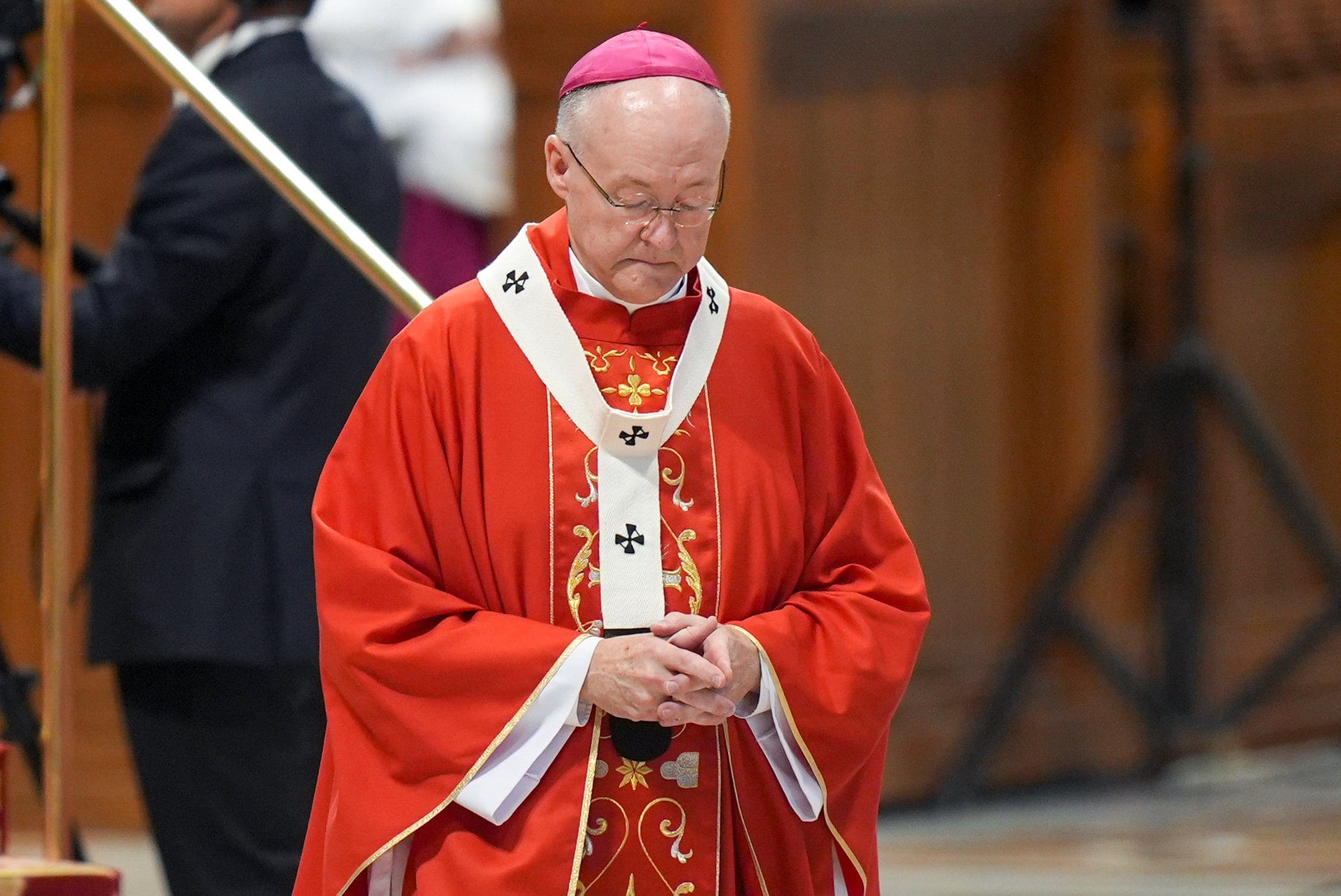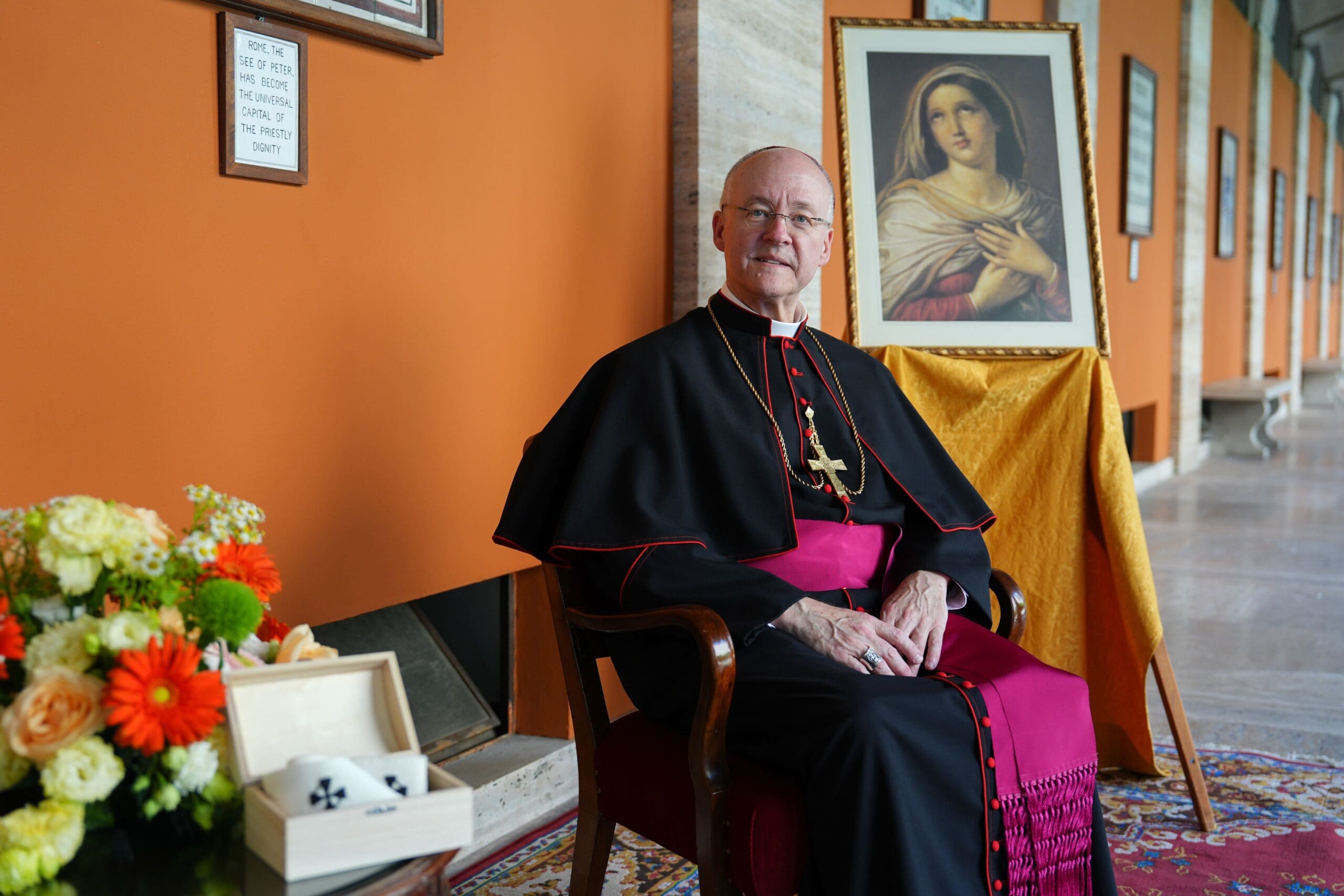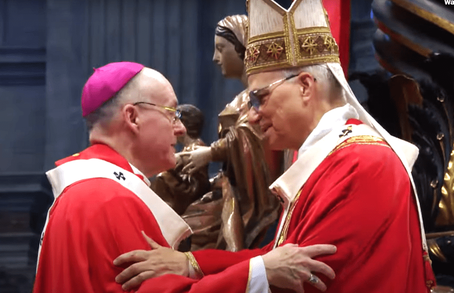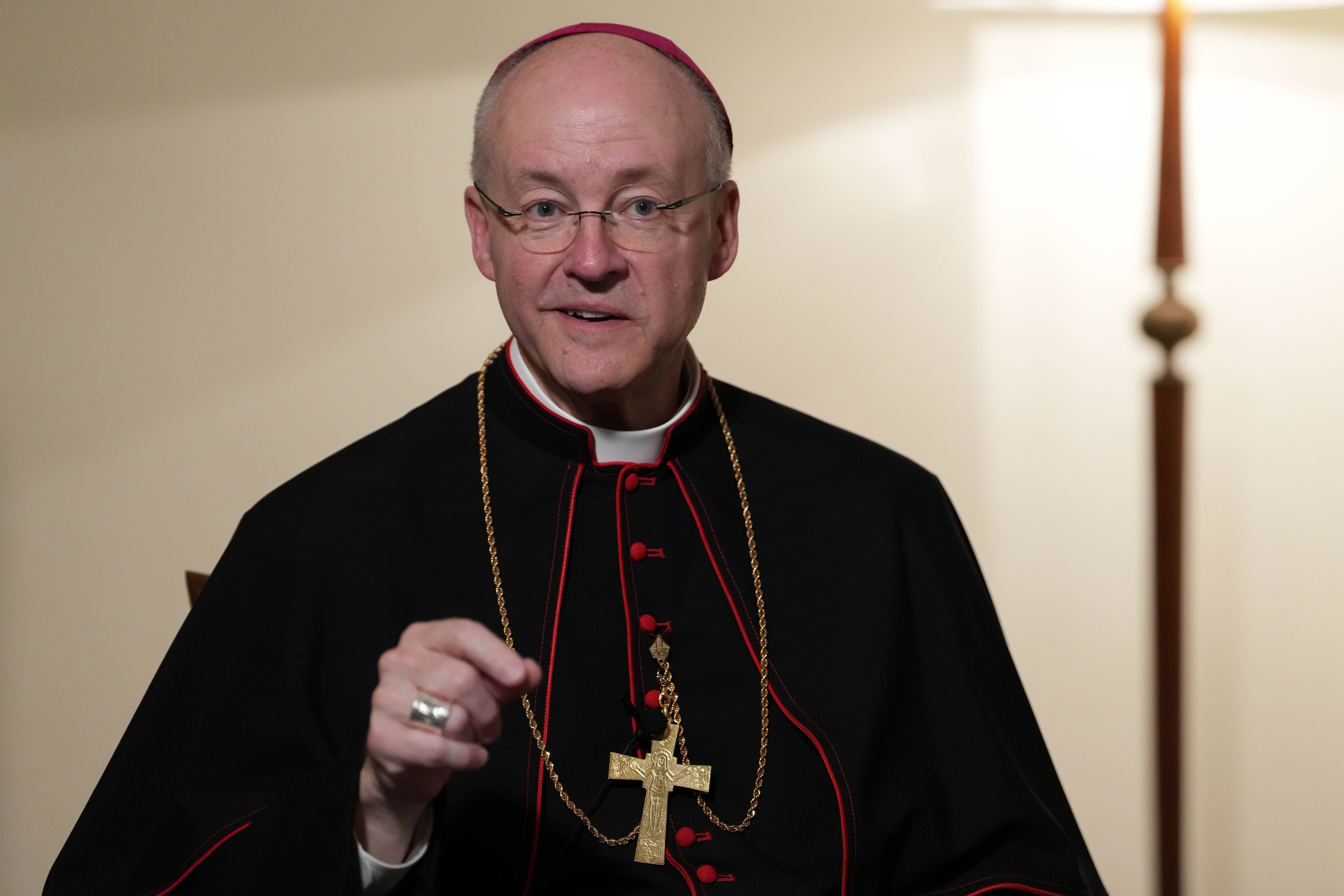 Archbishop Jeffrey S. Grob received his pallium — a white woolen vestment symbolizing pastoral authority and service to the people of God — from Pope Leo XIV on Sunday, June 29. Archbishop Grob was among 48 new metropolitan archbishops, including eight from the United States, to receive their pallium from the pope at a Mass on the Solemnity of Ss. Peter and Paul in St. Peter’s Basilica at the Vatican on June 29. (CNS photos/Lola Gomez)