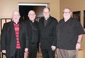 Former St. Katharine Drexel pastor Fr. William Key, left to right, Archbishop Jerome E. Listecki, pastor Fr. Michael Erwin and associate pastor Fr. Vincent Kobida pose for a photo on the day of the 10th anniversary Mass. (Submitted photos by Barbara Heinzen) and its issues to consideration of the parish’s mission of evangelization, according to its pastor, Fr. Michael Erwin.