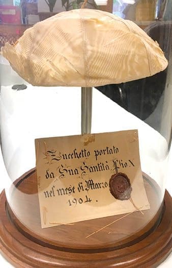 A zucchetto worn by Pope St. Pius X kept in the parish office.