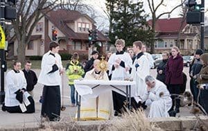 Fr. Luke Strand, kneeling before the Blessed Sacrament, and Schoenstatt Fr. Francisco Rojas, kneeling next to the table, lead a eucharistic procession from St. Patrick Parish, Whitewater, to the newly created adoration chapel in the Campus Ministry Center at the University of Wisconsin-Whitewater, Wednesday, March 16. (Catholic Herald photo by Peter Fenelon)