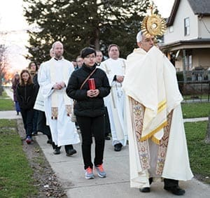 Schoenstatt Fr. Francisco Rojas leads the procession of the UW-Whitewater Catholic Student Coalition with the Eucharist from St. Patrick Church, Whitewater, pictured top left, through the streets of Whitewater to the Campus Ministry Center, on the school’s campus on March 16. (Catholic Herald photo by Peter Fenelon)While the chapel, which seats 12, will be used primarily for eucharistic adoration, daily Mass will be celebrated there several times a month, according to Zanin. It will be called the St. Mel Chapel, symbolizing the relationship between the UW-Whitewater community and St. Patrick Parish, as St. Mel was the nephew of St. Patrick.