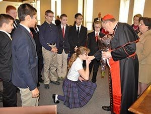 Ann Marie Gross, kneeling, fellow Trinity Academy students greet Cardinal Raymond L. Burke, following a morning assembly at the Pewaukee school on Thursday, Dec. 4. (Catholic Herald photo by John Kimpel)