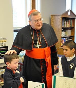 Cardinal Raymond L. Burke greets kindergartners, Jack Shanahan, left, and Thomas Ratnayake during his visit to Trinity Academy in Pewaukee on Thursday, Dec. 4. (Catholic Herald photo by John Kimpel)