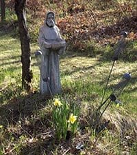 Located in a forest behind the church, the walk begins at a white birch cross. The short path is a level grassy loop that winds its way through towering pines and fields of ferns. Each station features an event from the life of St. Francis with a concluding question for meditation.