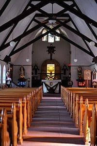 Since 1881 this parish has served Catholic Ojibwe people of the Lac Courte Oreilles reservation. The church’s interior features Native American artistic embellishments including a deer hide wigwam housing the tabernacle.