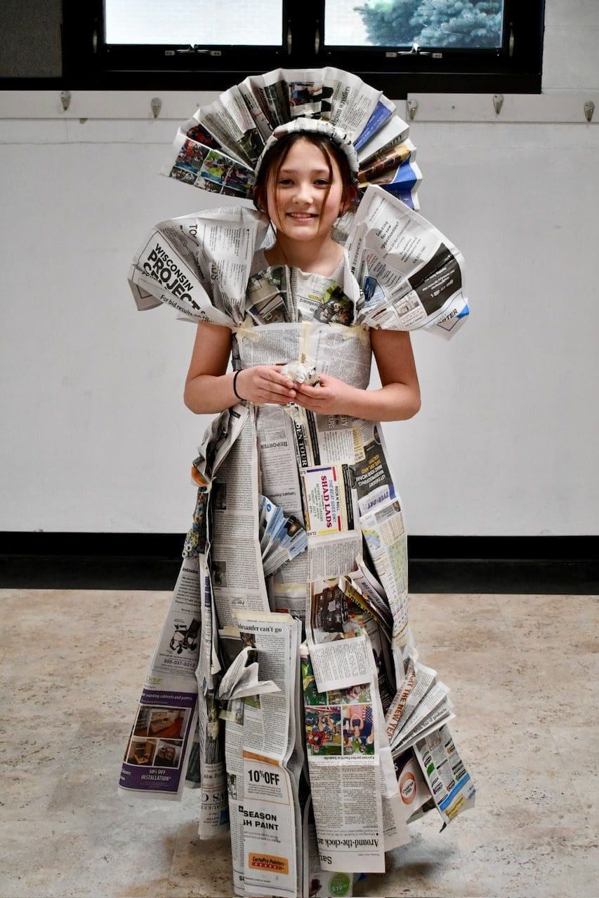 During Catholic Schools Week, St. John XXIII School, Port Washington, had a newspaper fashion show. During this team-building activity, middle school students worked in teams to design an outfit using only paper items. (Submitted photo)