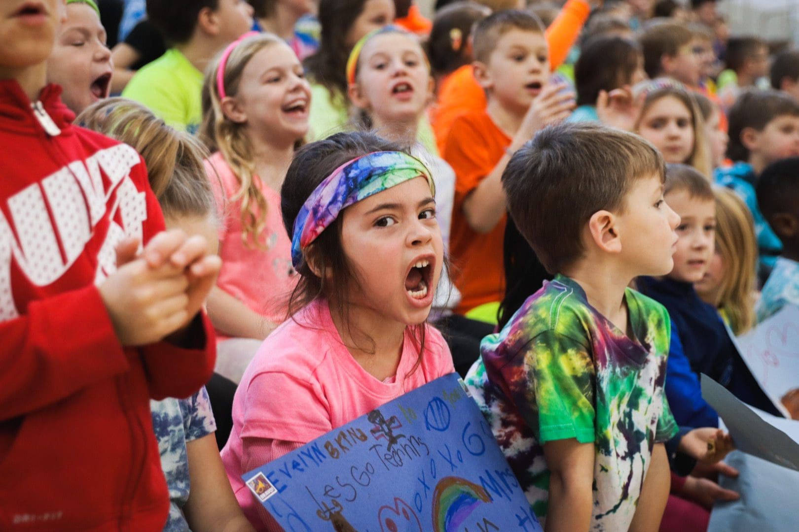 Students at St. Mary, Menomonee Falls, really got into cheering during the teachers vs. eighth-graders basketball game. (Photo by Anne MacGillis)