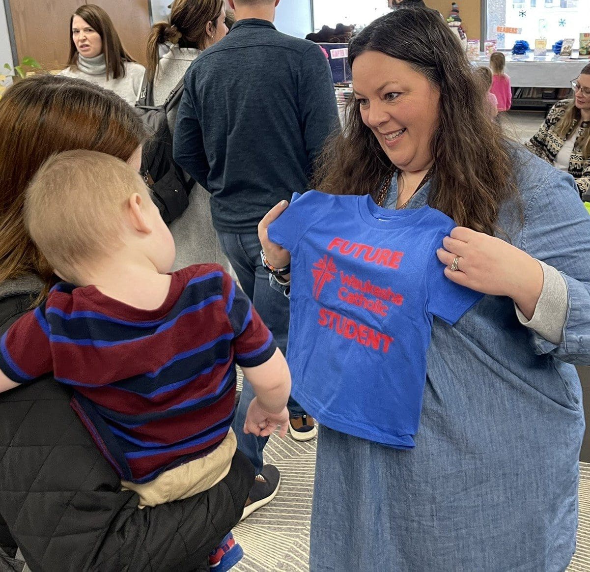 Meghan Gorzalski, Director of Admissions and Marketing for Waukesha Catholic School System, presents a t-shirt to the younger brother of current WCSS students at the Open House at St. William on Sunday, Jan. 28. (Photo by Larry Hanson)