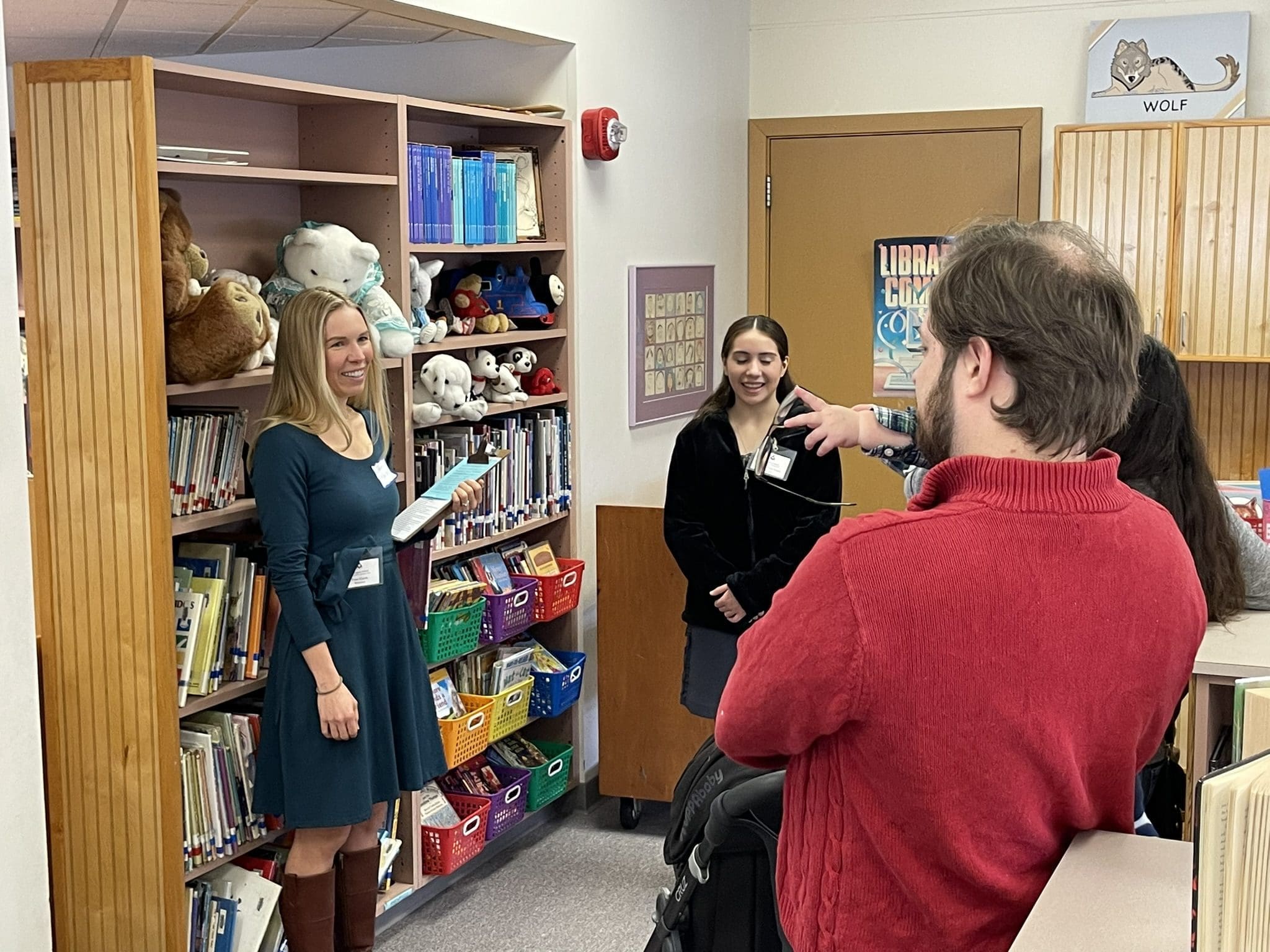 A parent tour guide speaks with prospective parents in the library at St. Eugene, Fox Point, during the school’s Open House on Sunday, Jan. 28. (Photo by Larry Hanson)