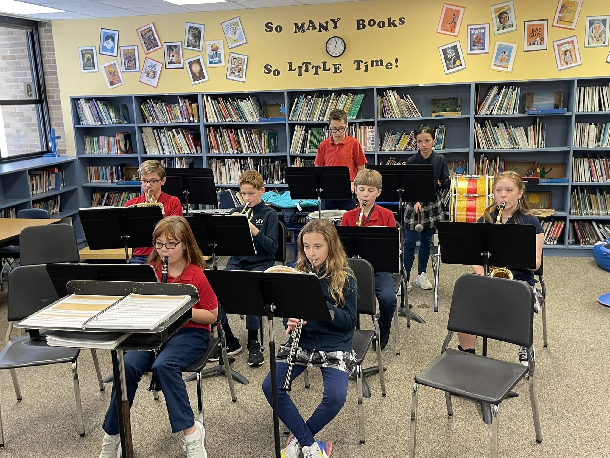 The band at St. John Vianney, Brookfield, played in the school library for parents and visitors during the Open House on Sunday, Jan. 28. (Photo by Larry Hanson)