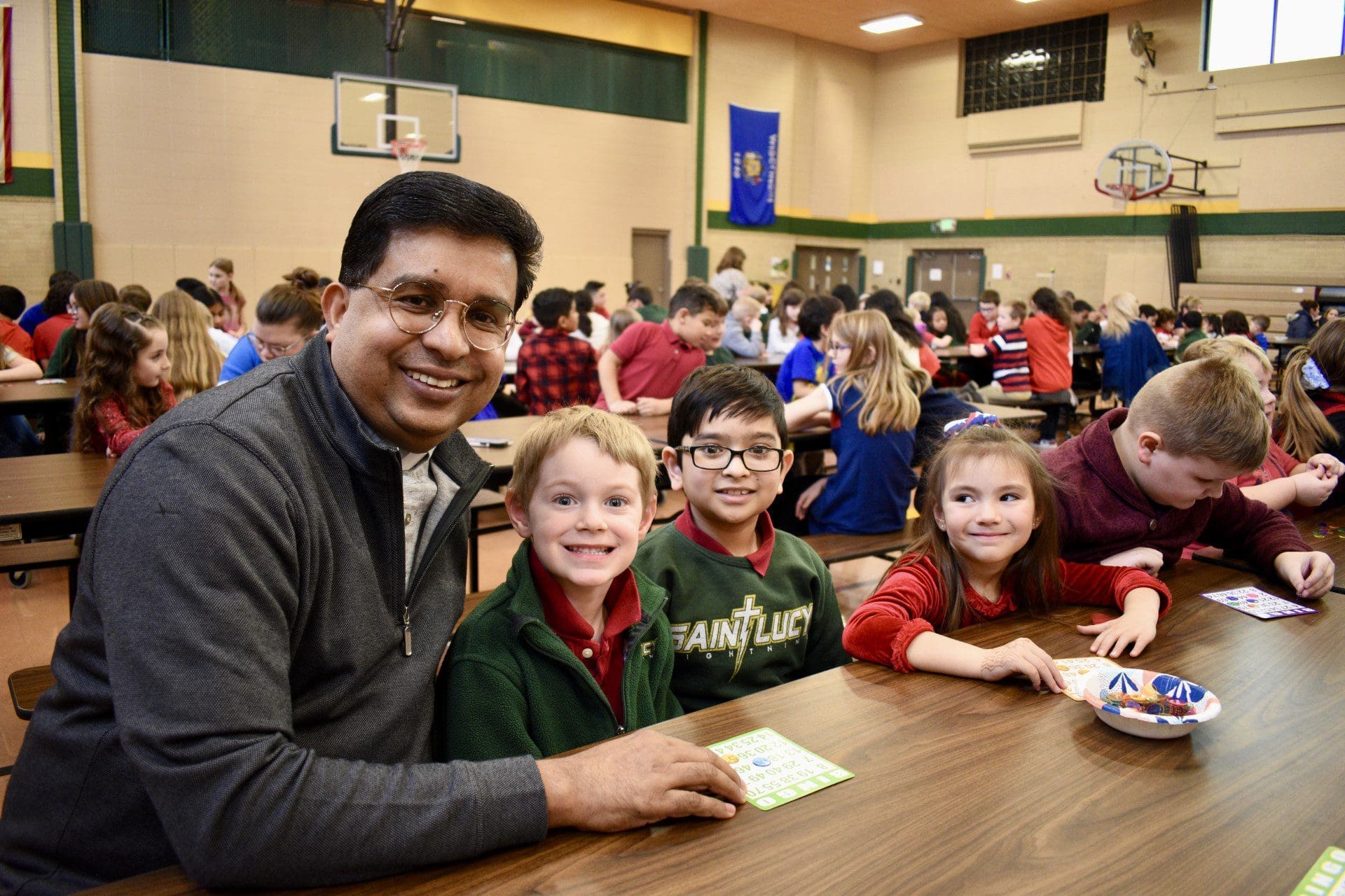 St. Lucy, Racine, Pastor Fr. Thomas Vathappallil, M.C.B.S., enjoys a game of Bingo with school students during Catholic Schools Week. (Submitted photo)