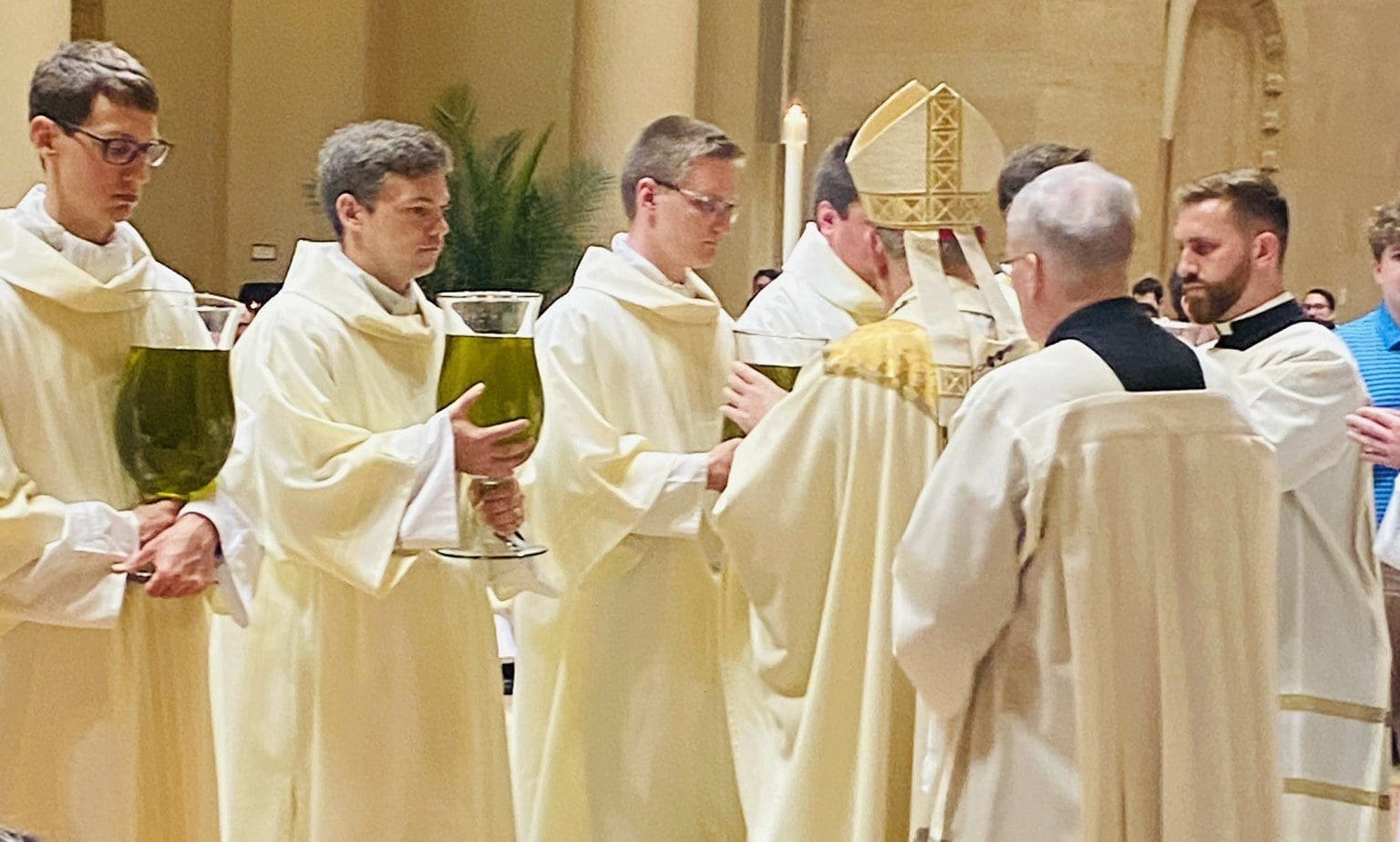 Nearly three dozen volunteers from the archdiocese staff assisted with setup, greeting and distribution of the oils. Seminarians served as acolytes.