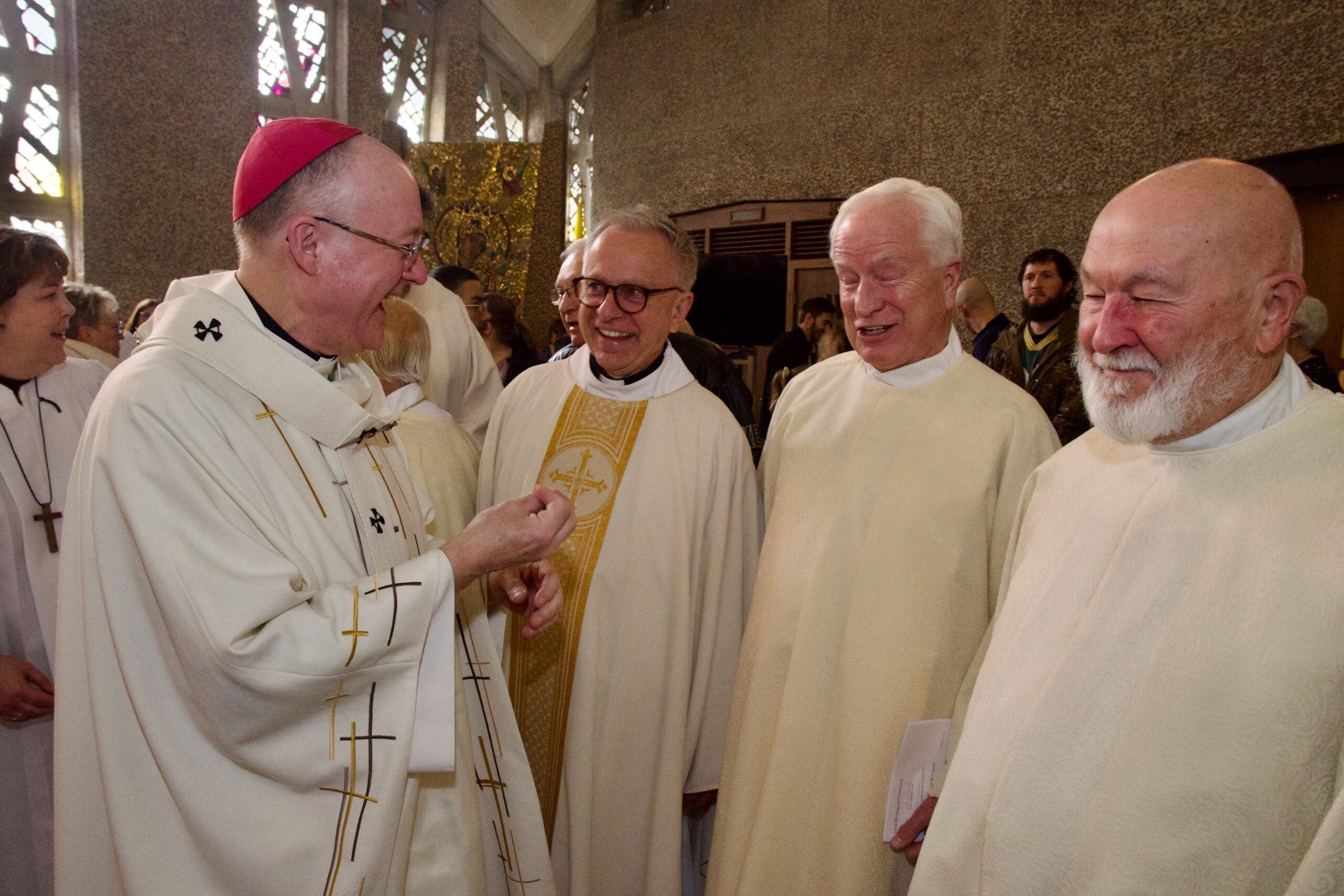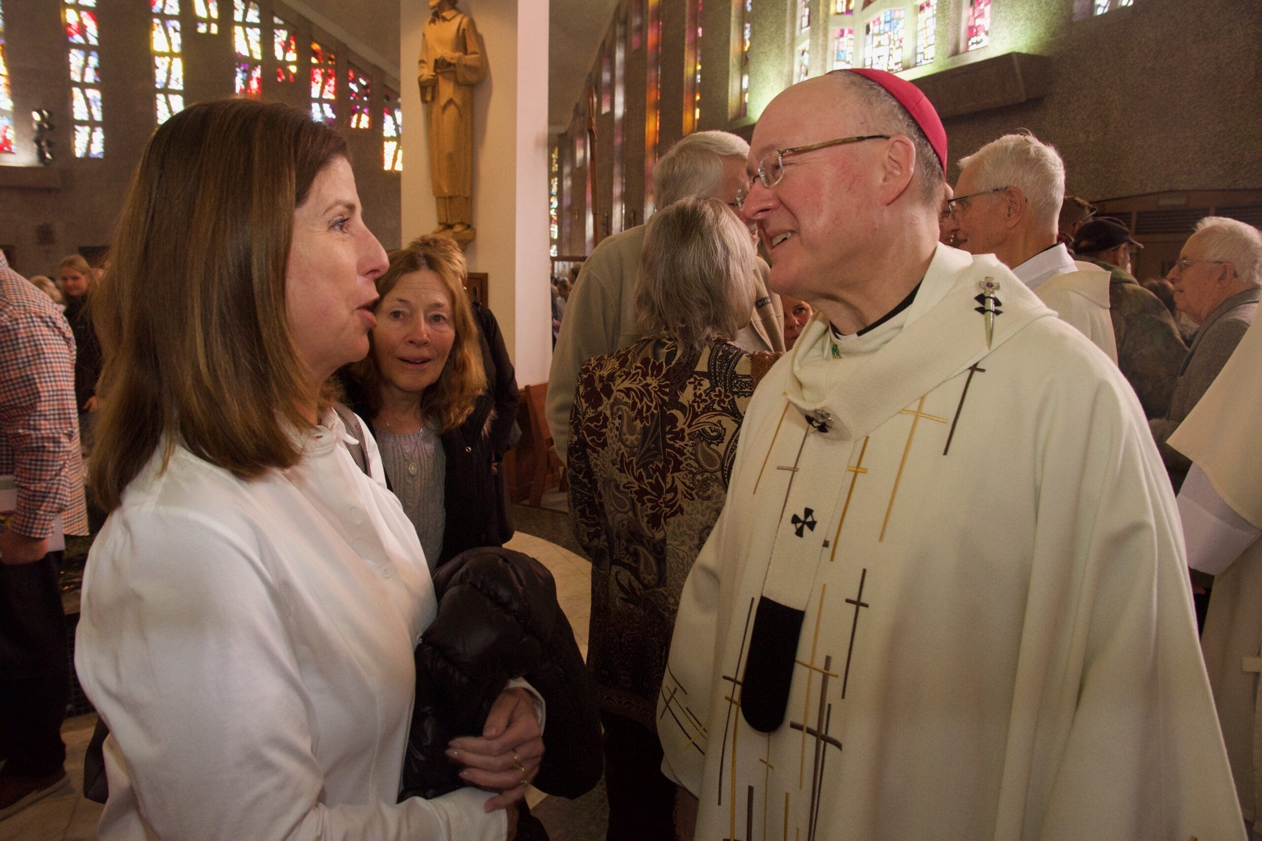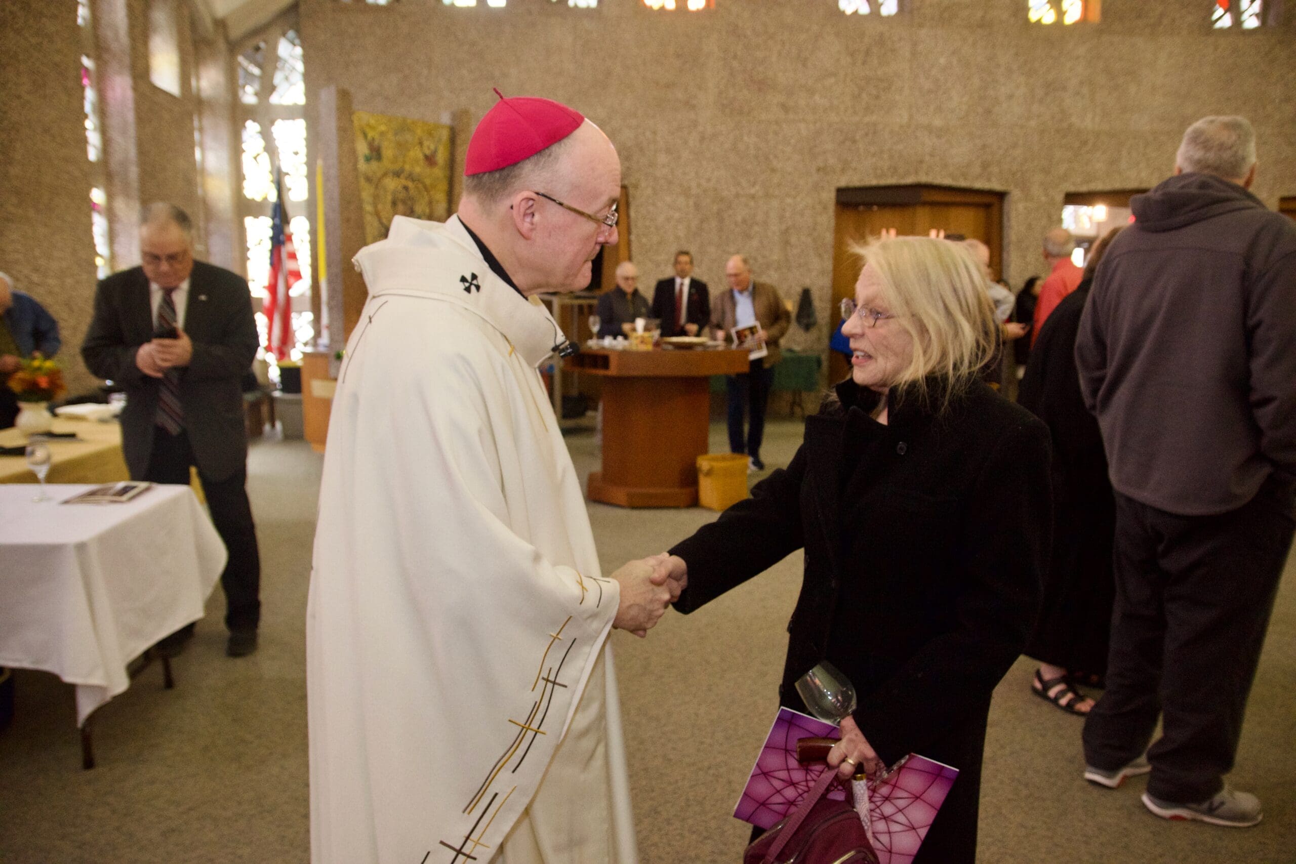 Archbishop Jeffrey S. Grob, who presided at the last Mass celebrated at St. Rita Church, West Allis, Nov. 23, visits with Mass goers afterward. (Photos by seancsmithphotos.com)