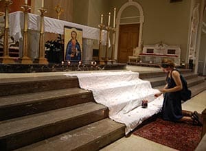 Adam Klarner and his friend, Jolene Arnold, grew up Catholic but admit they’re not practicing. However, that didn’t stop them from going inside to light a candle when they were invited.