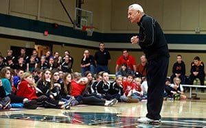 Retired Hall of Fame basketball coach Dick Bennett speaks to about 500 middle school athletes, parents and coaches Jan. 11 at St. Dominic Parish, Brookfield. (Catholic Herald photo by Allen Fredrickson)