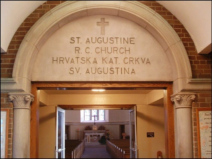 As the visitor opens the main door and begins to climb the steps to the sanctuary entrance, three beautiful traditional stained-glass windows depicting St. Paul, Our Lady of Guadalupe and St. Peter grace the stairway. The church’s original stone arch entrance remains intact and etched with the inscription, “St. Augustine, R.C. Church. Hrvatska Kat Crkva, SV. Augustina.” A statue of St. Augustine of Hippo is just off to the left, providing an additional welcome.