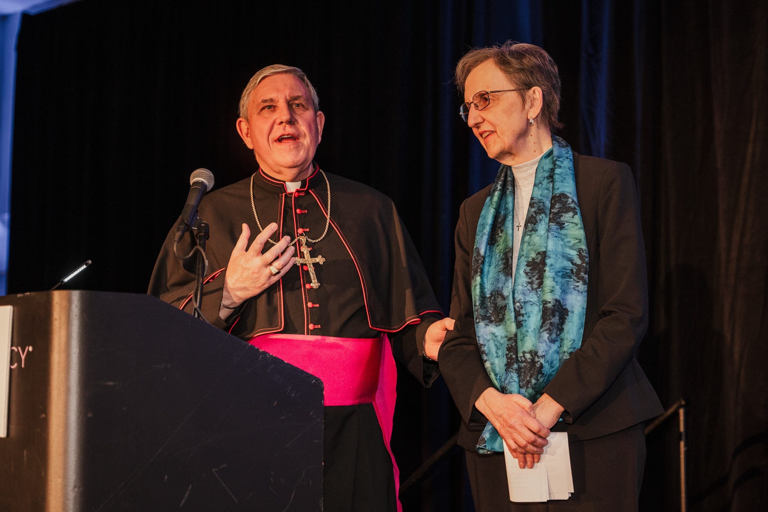 Dr. Kathleen Cepelka (right), shown with Archbishop Jerome E. Listecki, was honored for her 53 years of service to Catholic education at the Catholic Schools Dinner on Thursday, March 10. Dr. Cepelka is retiring as the superintendent of Catholic schools at the end of the school year. (Photo by Pete Fenelon)