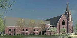 The architectural rendering of the St. Patrick Church, Elkhorn, addition and renovation project – which includes replacing the asbestos church roof, working on the bell tower, painting the interior of the church, fireproofing the roof, installing sprinklers and new flooring – is scheduled to begin in October. (Architectural renderings submitted courtesy St. Patrick Parish, Elkhorn)interior of the church, which holds 400 people, said Fr. Regales. The church roof will be fireproofed, sprinklers will be installed and the flooring in the church will be replaced with tile and carpet.