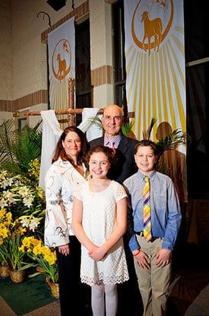The Nunnally family, Brenda, Dave and their children, Davis and Caroline, pose for a photo in their new parish home, St. Joan of Arc Parish, Nashotah. During this past Easter Vigil Mass, Brenda, Davis and Caroline were welcomed fully into the Catholic Church. (Catholic Herald photo by Juan C. Medina)Brenda Nunnally was a Lutheran when she married Dave, a Catholic, in St. Louis in 1998. As they raised son Davis,12, and daughter Caroline,10, the family identified more with the Lutheran tradition, and found a spiritual home at their church in St. Louis.