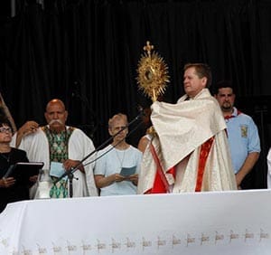 Fr. Timothy Kitzke, co-pastor of Three Holy Women Parish, Milwaukee, leads Benediction following last year’s Festa Italiana Mass and procession Sunday, July 20. (Submitted photo courtesy Rory Gillespie)