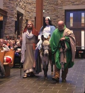 Mary, riding a donkey and played by Elise Winkel, processes into church with Joseph, left, played by real-life husband Devin Winkel, and an animal handler from Glacier Ridge Animal Farm, right, who leads the donkey, during the live Nativity at Holy Family which featured live animals and dozens of costumed staff members. (Submitted photo by Matthew Rodenkirch, Holy Family Catholic Community Staff)
