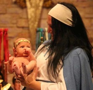 Elise Winkel, portraying Mary in the live Nativity staged by Holy Family Parish, Fond du Lac, on Sunday, Dec. 3, holds up baby Jesus, played by her 6-week-old nephew, Arthur Dunphy. (Submitted photo by Matthew Rodenkirch, Holy Family Catholic Community Staff)