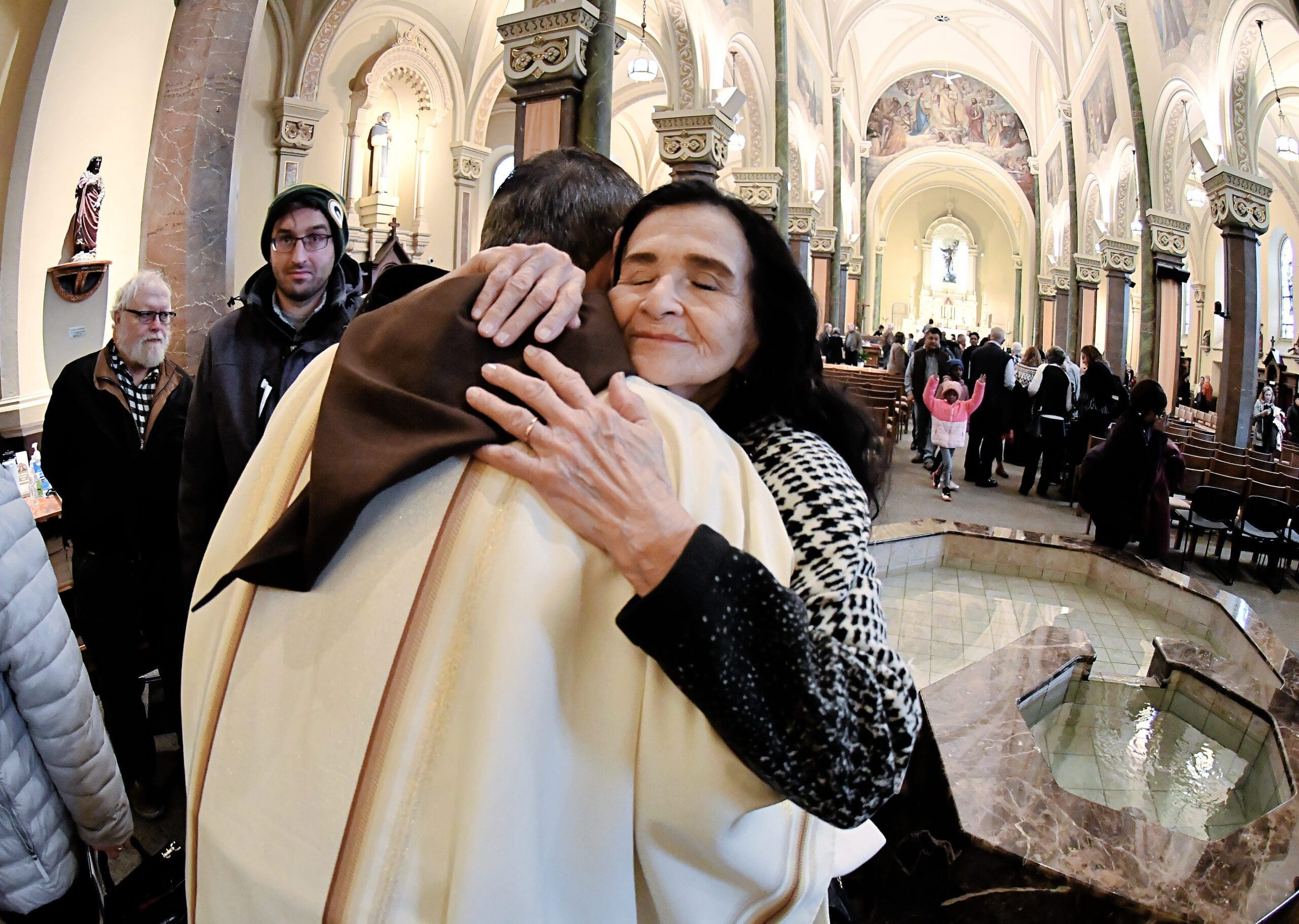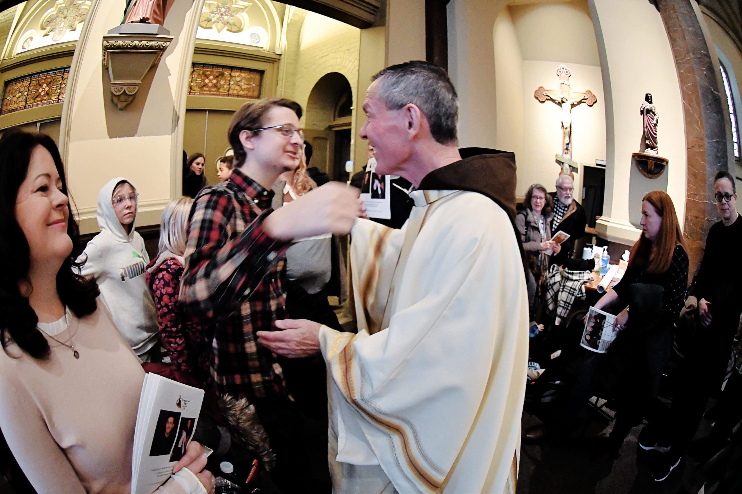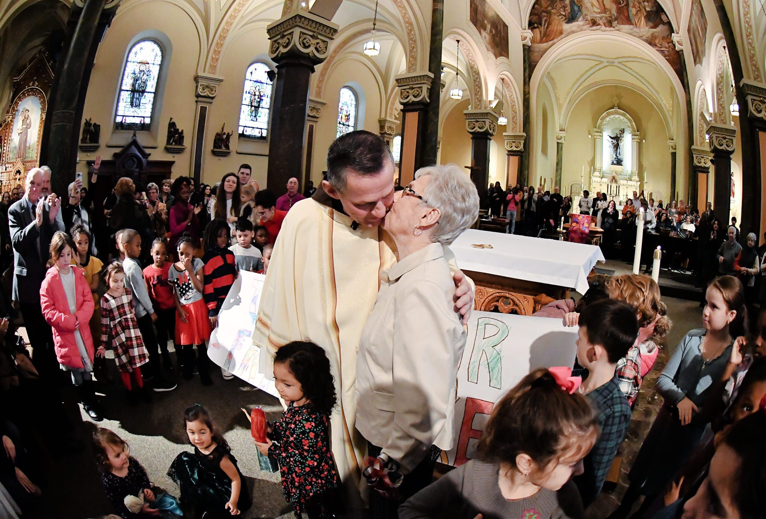 Fr. Michael Bertram, O.F.M. Cap., receives a kiss from his mother, Lyla, after his final Mass at St. Francis of Assisi Parish in November. (Photo by David Bernacchi)
