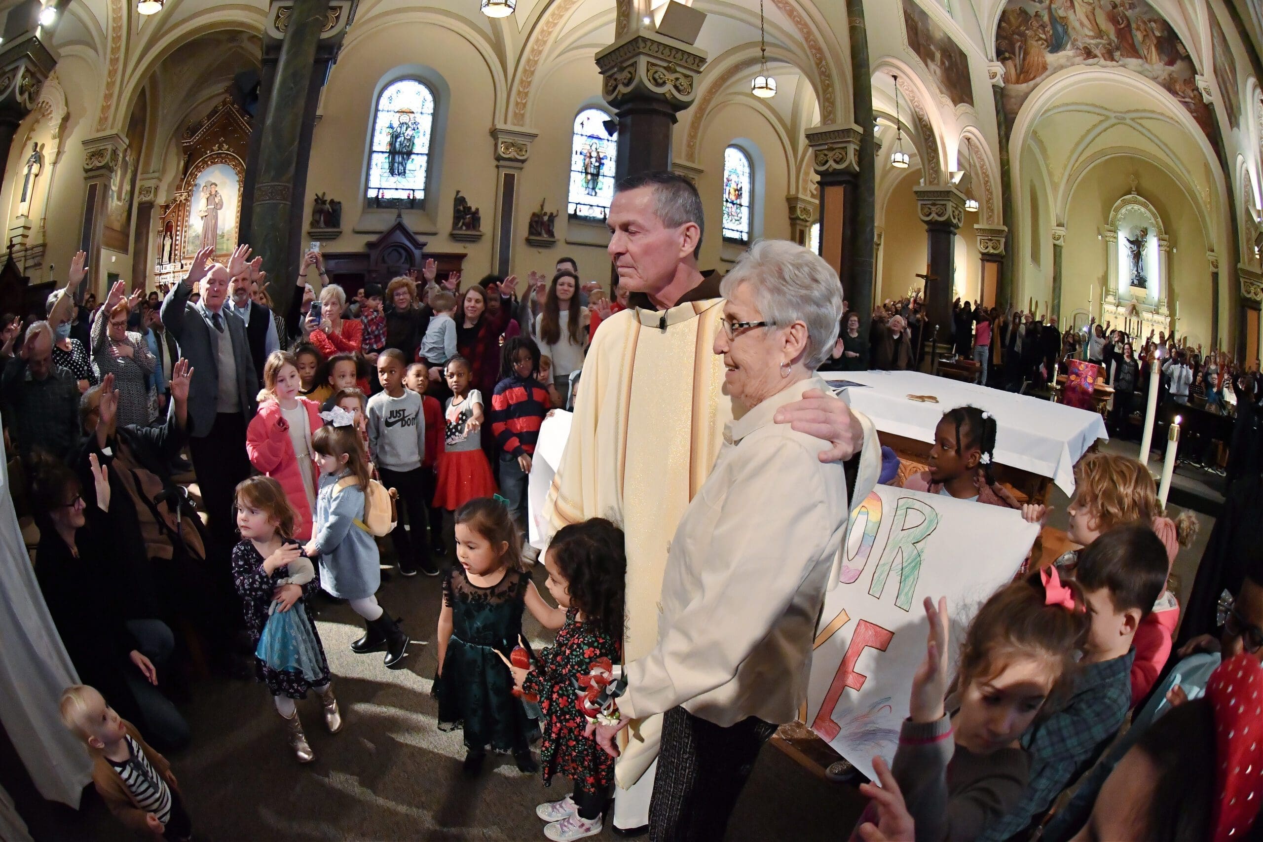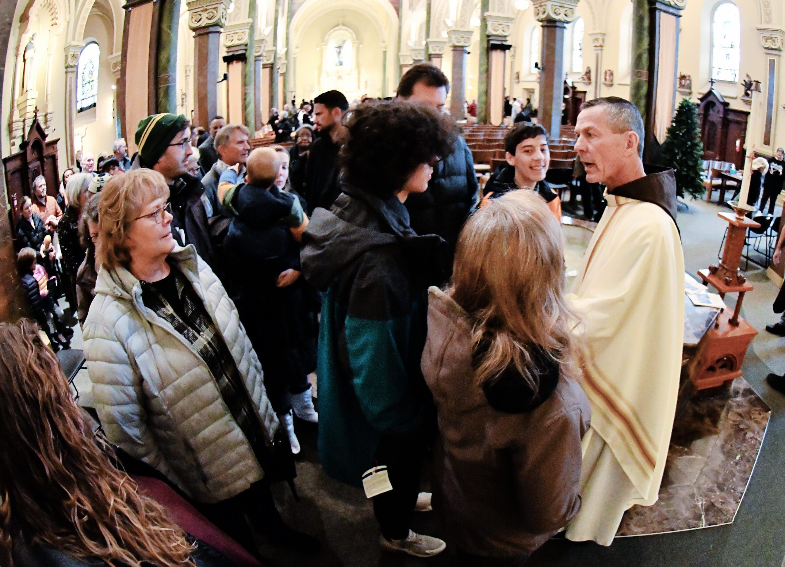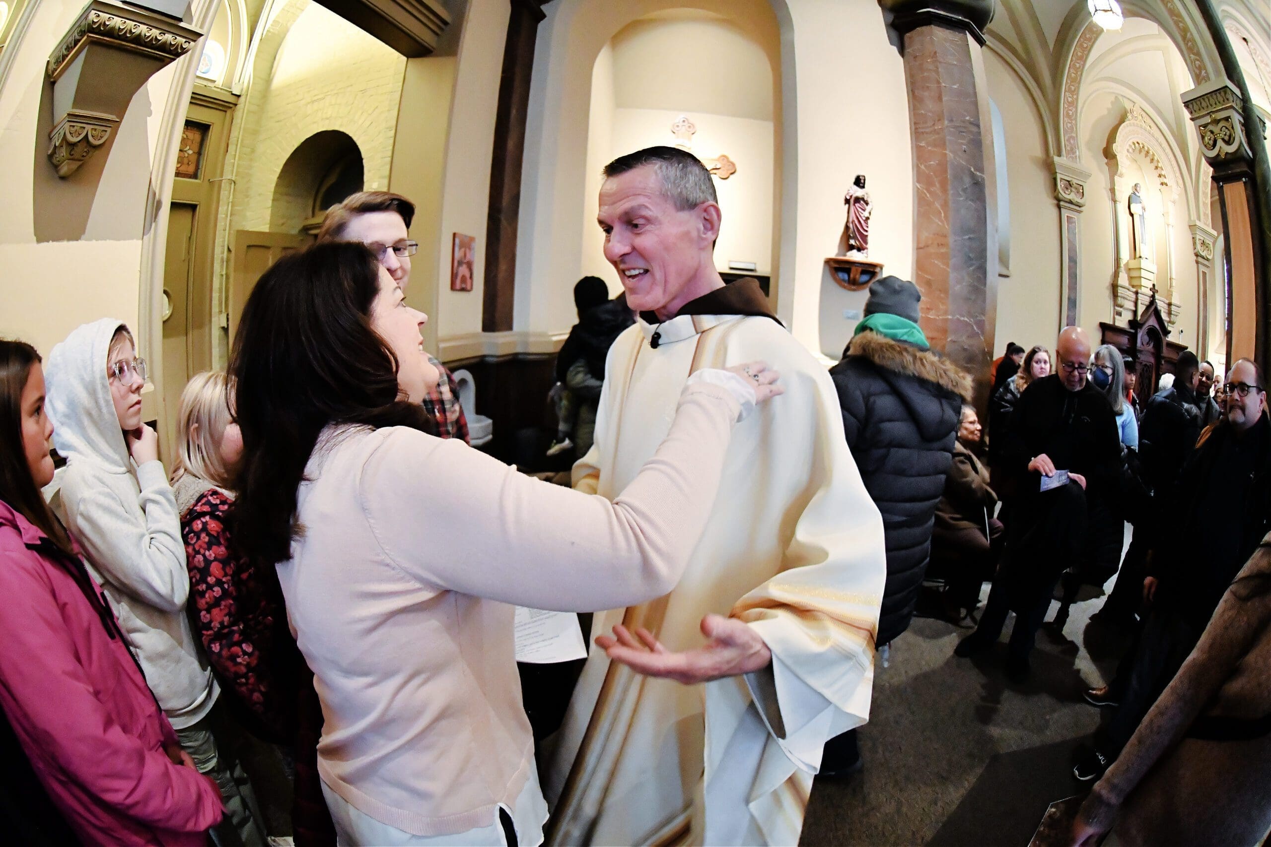 Fr. Michael Bertram, O.F.M. Cap., receives a kiss from his mother, Lyla, after his final Mass at St. Francis of Assisi Parish in November. (Photo by David Bernacchi)