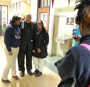 Following his talk to Messmer High School students on Jan. 30, Fr. Clements poses for a photo with Nyriah Crawford, left, and Daja Le Flore, right. (Catholic Herald photo by Ricardo Torres)“There would never be a civil rights movement ever if it hadn’t been for the fact that we had many, many, many white people who stood up behind our black people and our Latino people, and who fought for our rights, and don’t you dare leave those white people out of this struggle,” Fr. Clements told the Messmer students. “They are the ones why we have a black president of the United States right now.”