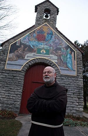 Franciscan Fr. Kim Studwell stands outside a replica of the Portiuncula Chapel in Assisi, Italy, located on Franciscan Friary grounds in Burlington on Nov. 20. The Friary will host a Day of Prayer on Dec. 13 to mark the 800th anniversary of the Portincula Pardon. (Catholic Herald photo by Allen Fredrickson)behind the altar. These days, the sound of a novitice playing the violin may be heard throughout the wooden halls of the main house.