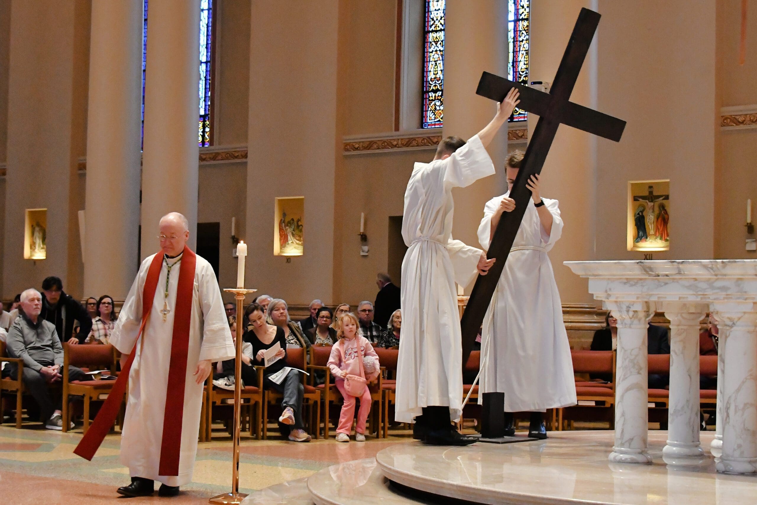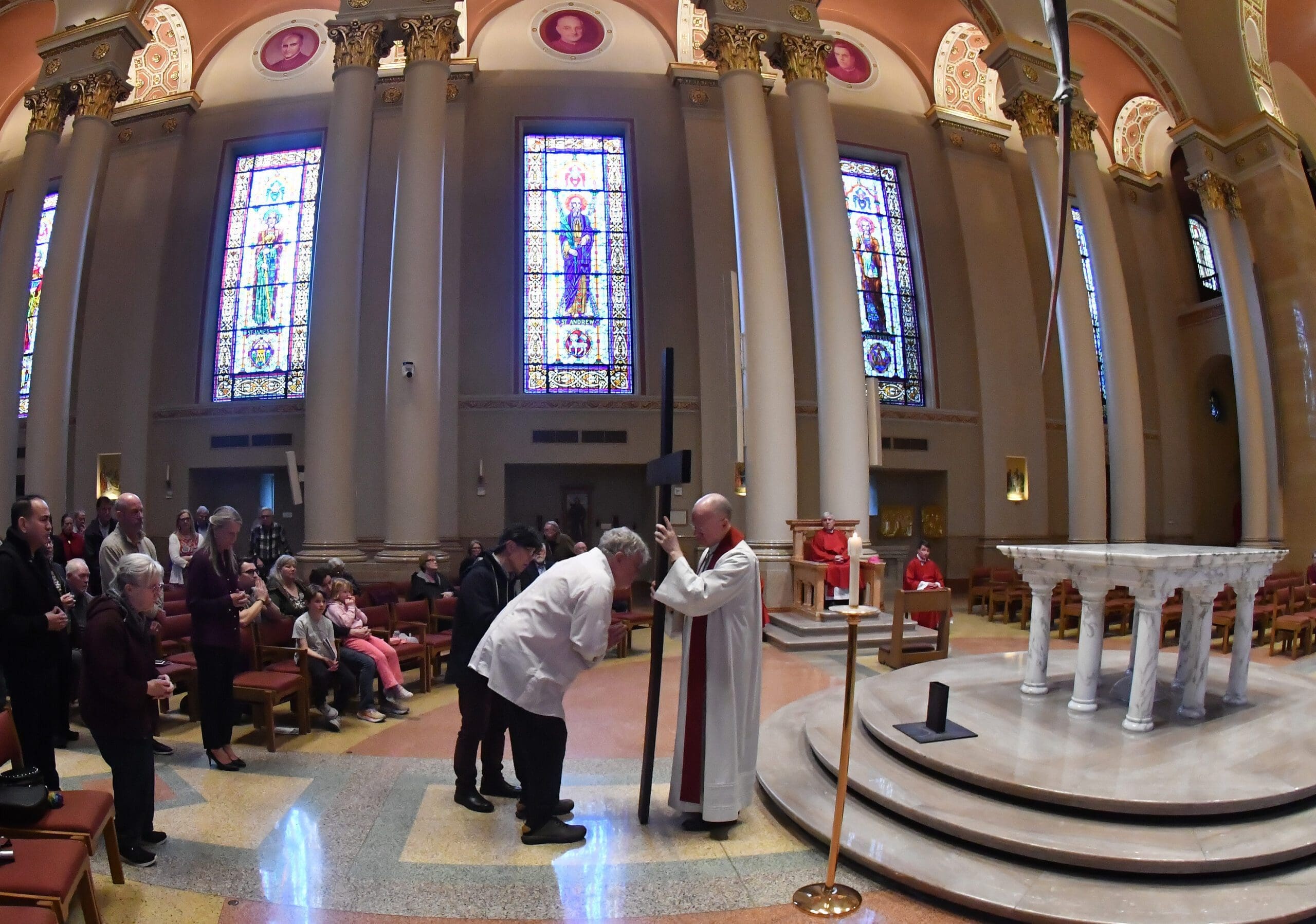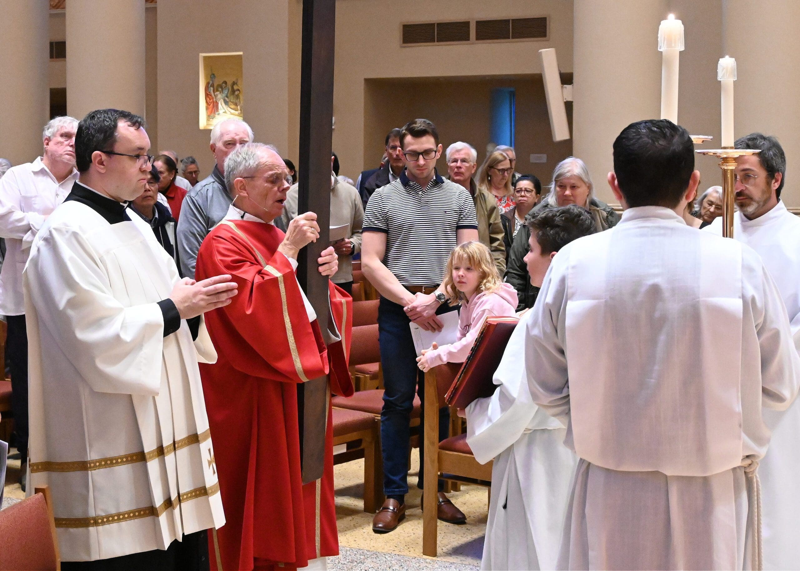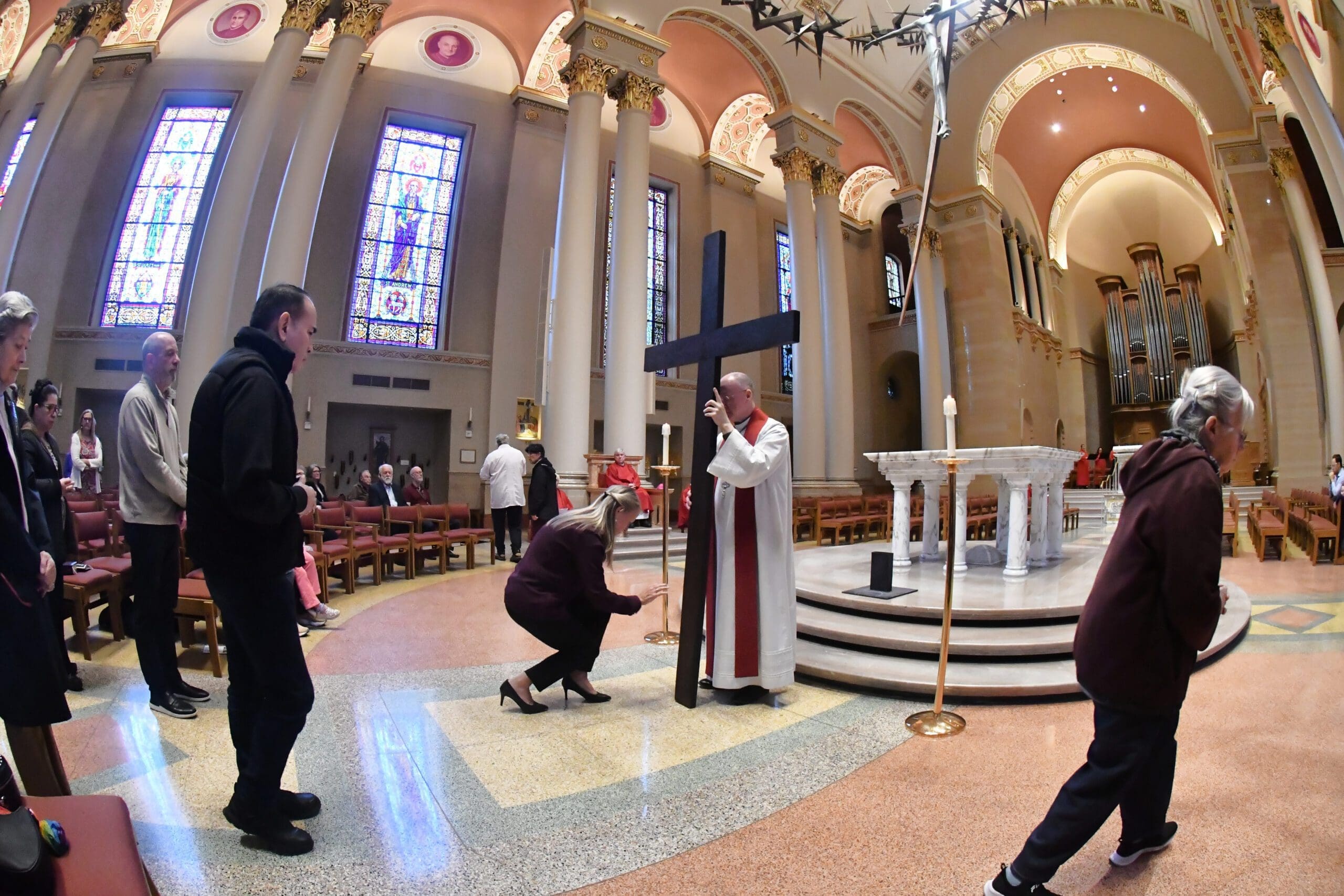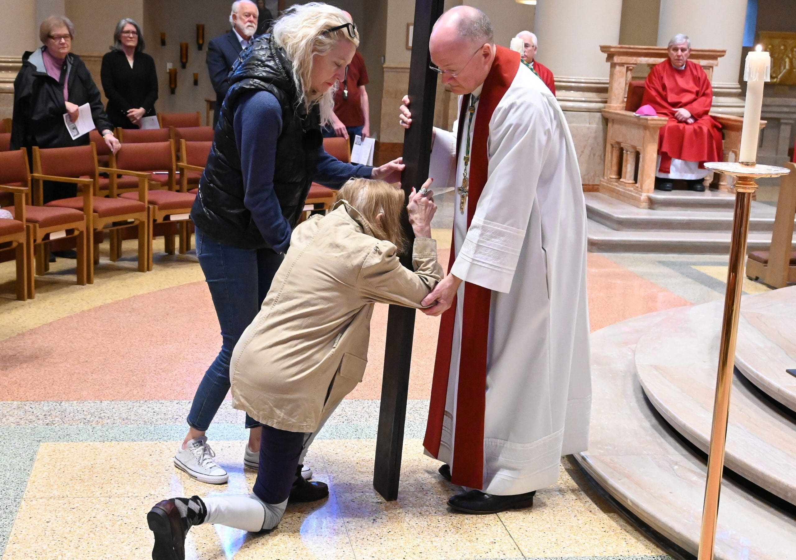 Archbishop Jeffrey S. Grob offers Veneration of the Cross to the faithful attending the Celebration of the Passion of the Lord service on Good Friday, April 18, at the Cathedral of St. John the Evangelist, Milwaukee. (Photos by David Bernacchi)