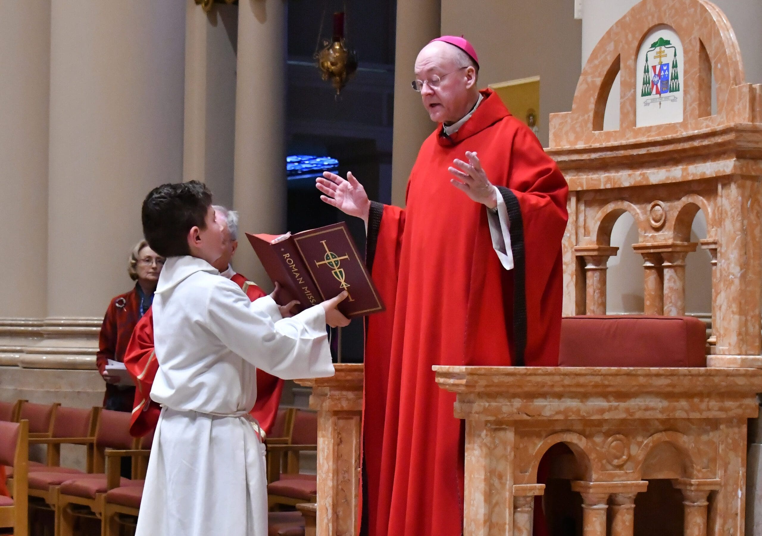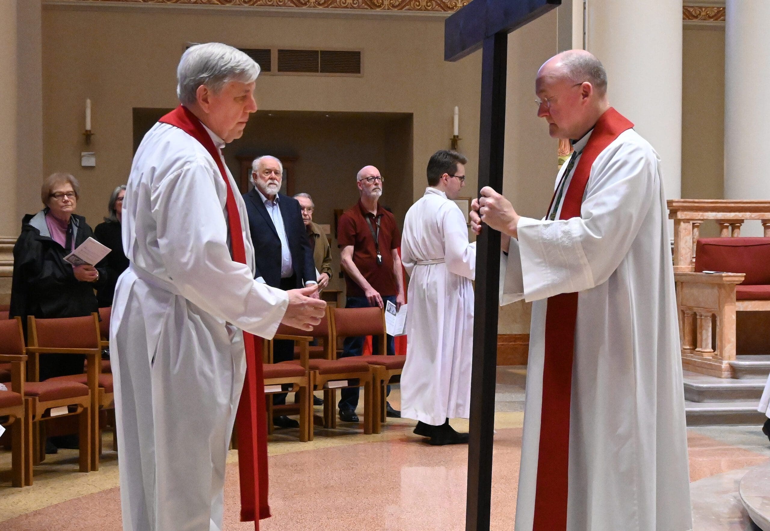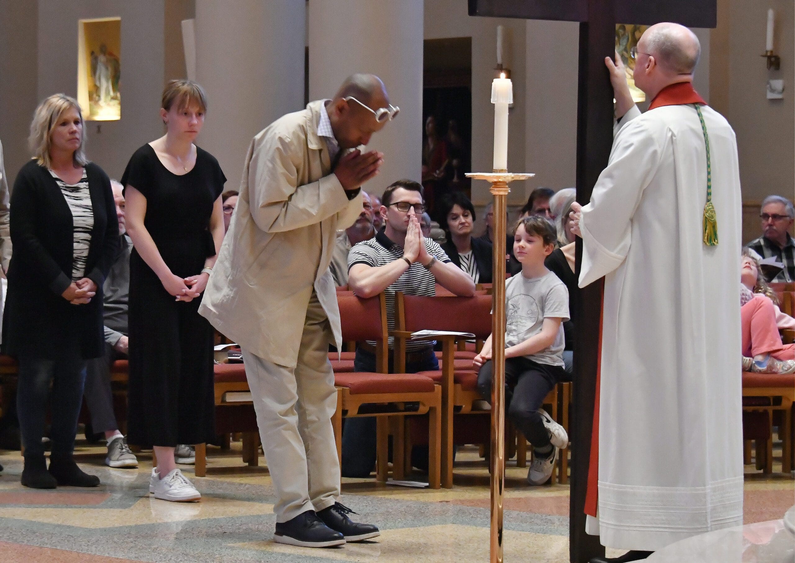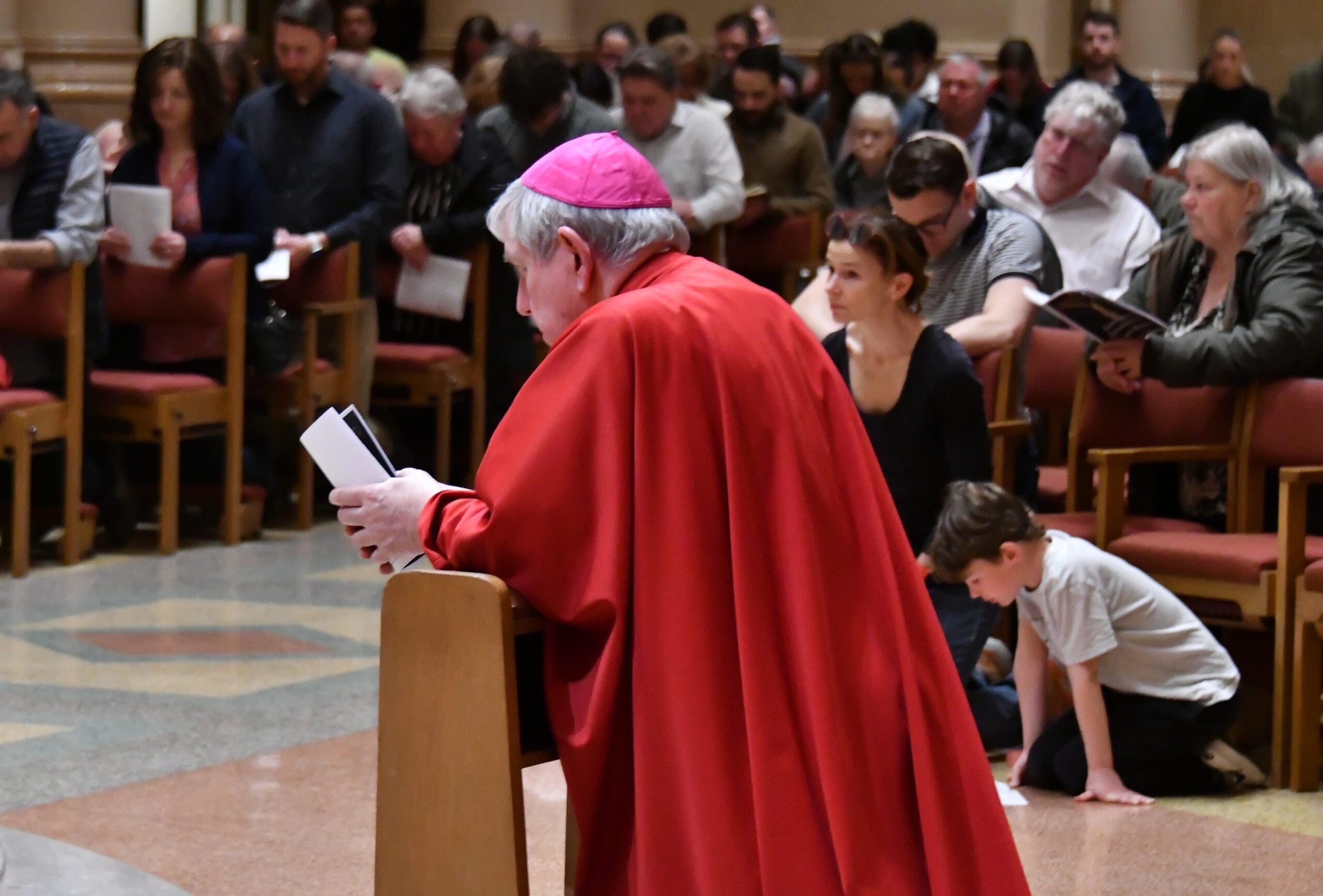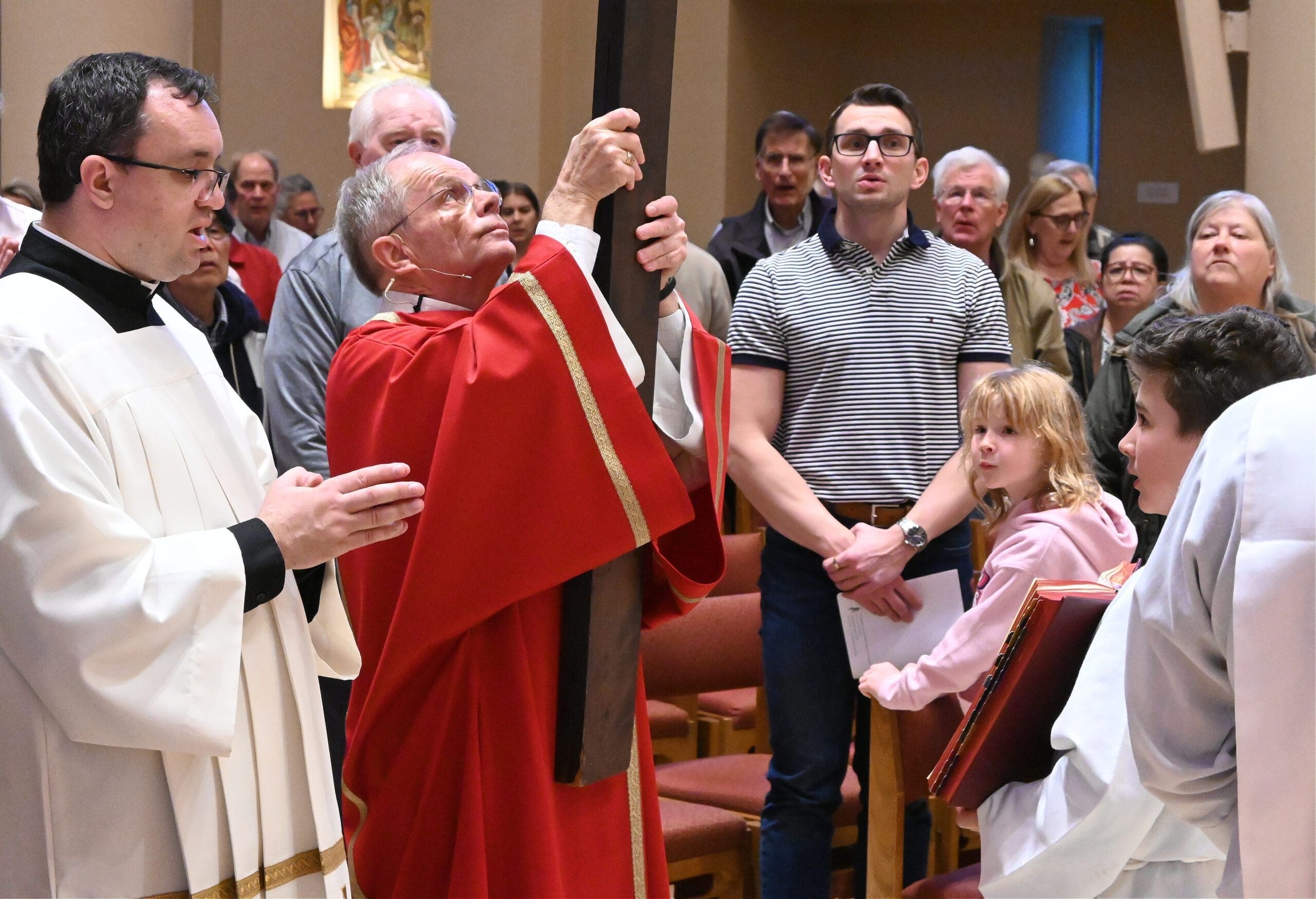 Archbishop Jeffrey S. Grob offers Veneration of the Cross to the faithful attending the Celebration of the Passion of the Lord service on Good Friday, April 18, at the Cathedral of St. John the Evangelist, Milwaukee. (Photos by David Bernacchi)