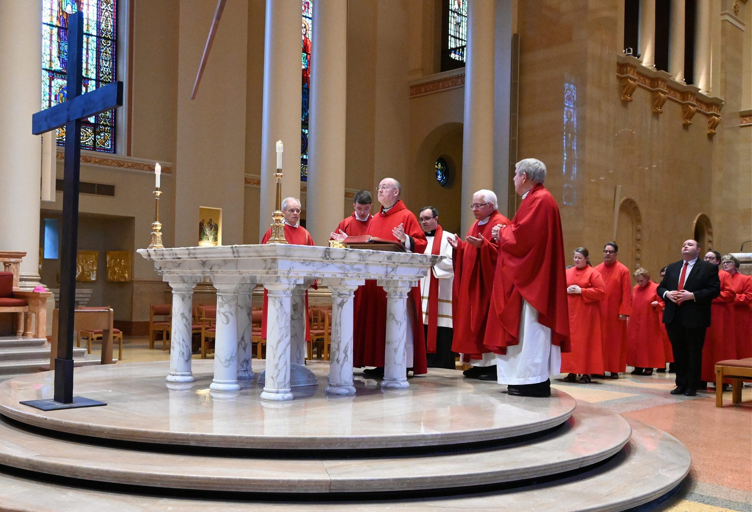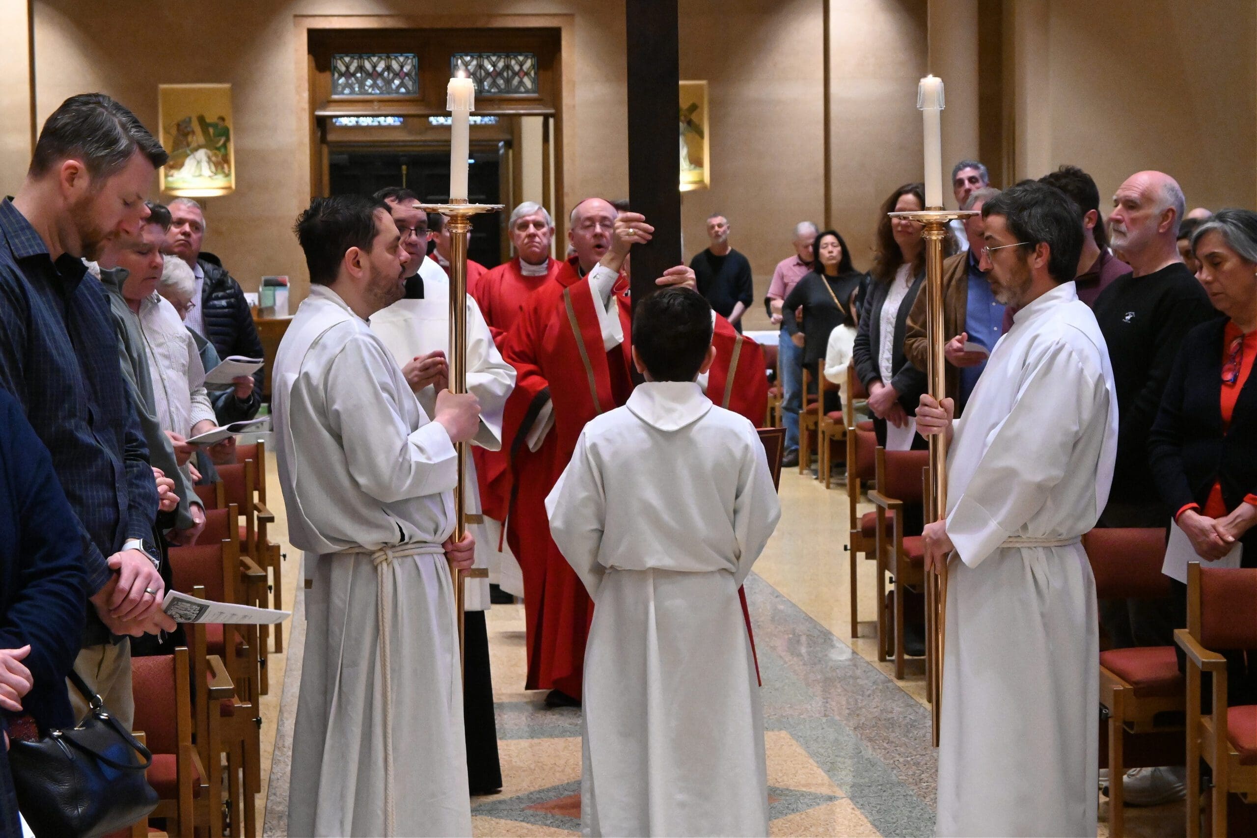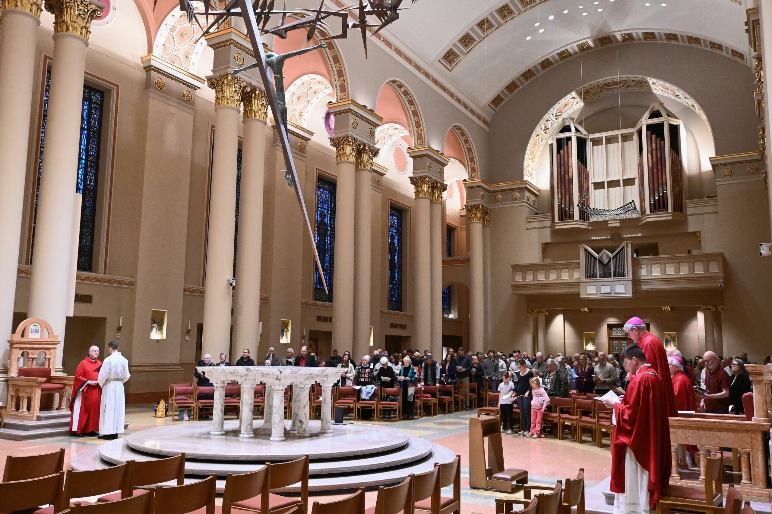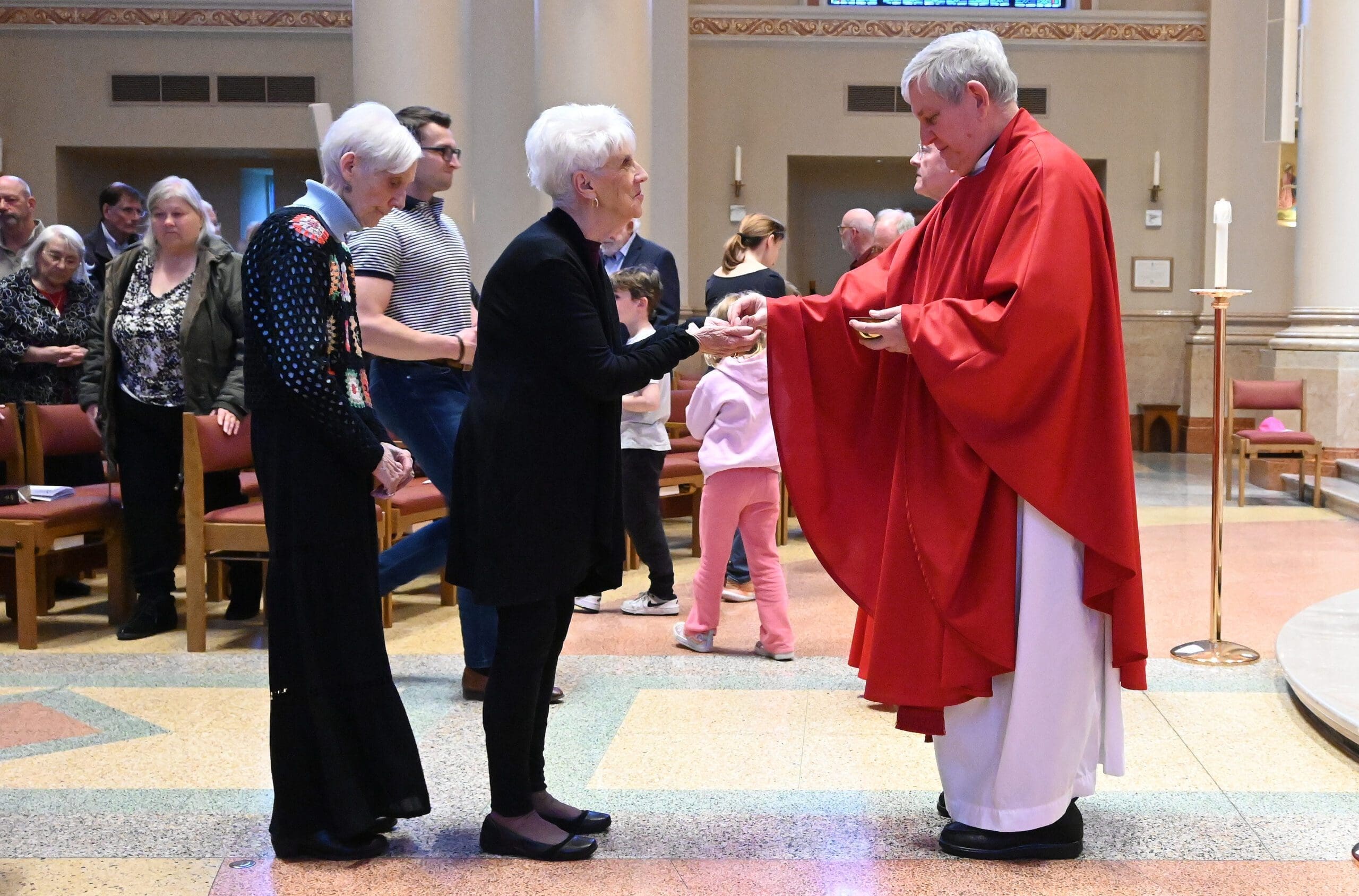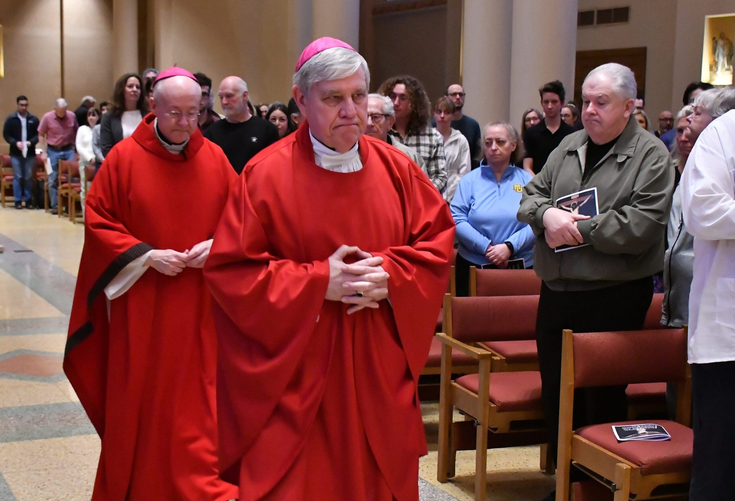 Archbishop Jeffrey S. Grob offers Veneration of the Cross to the faithful attending the Celebration of the Passion of the Lord service on Good Friday, April 18, at the Cathedral of St. John the Evangelist, Milwaukee. (Photos by David Bernacchi)