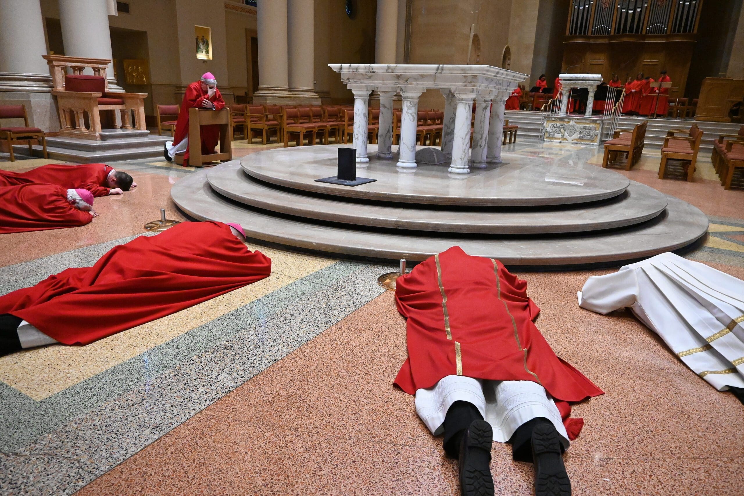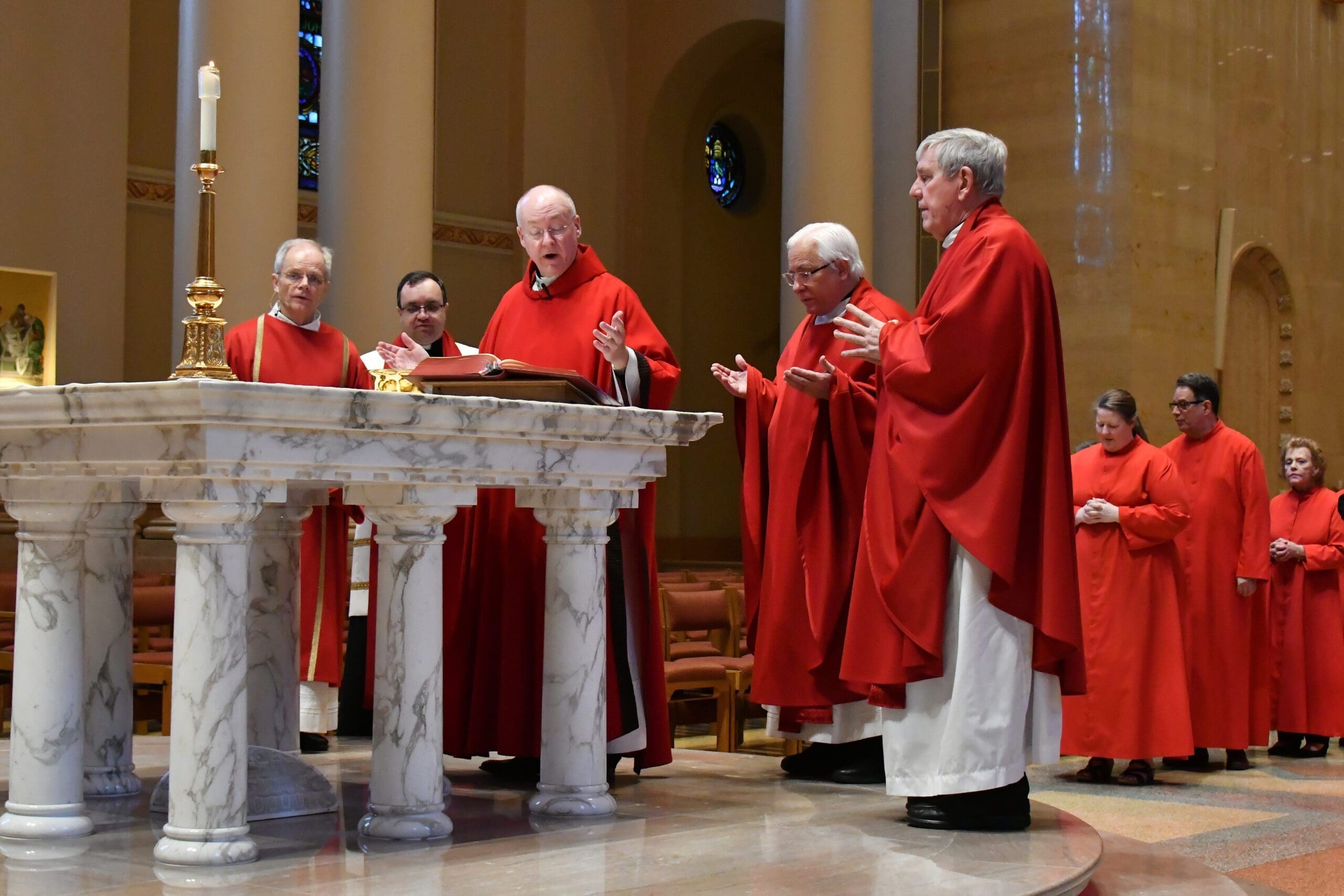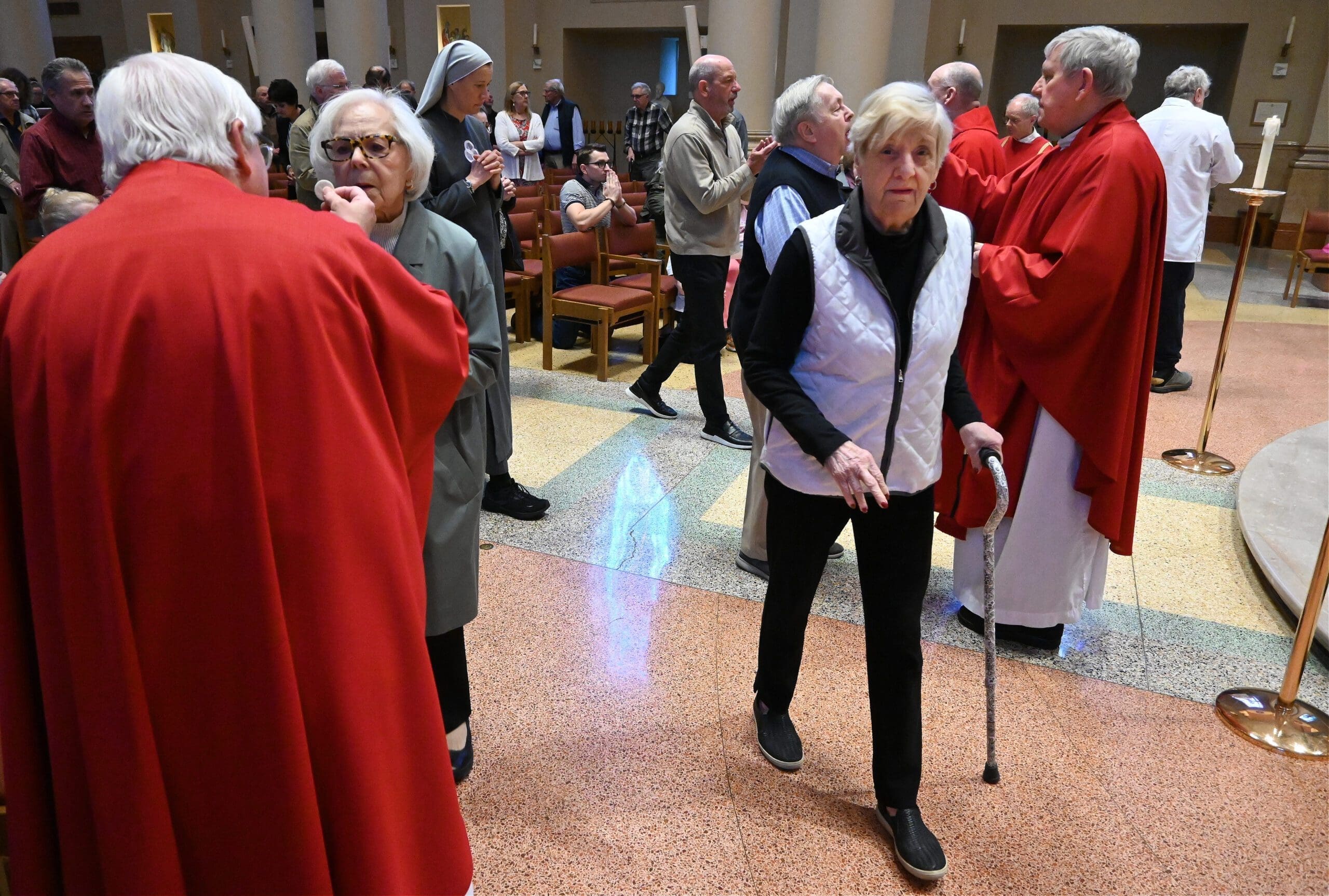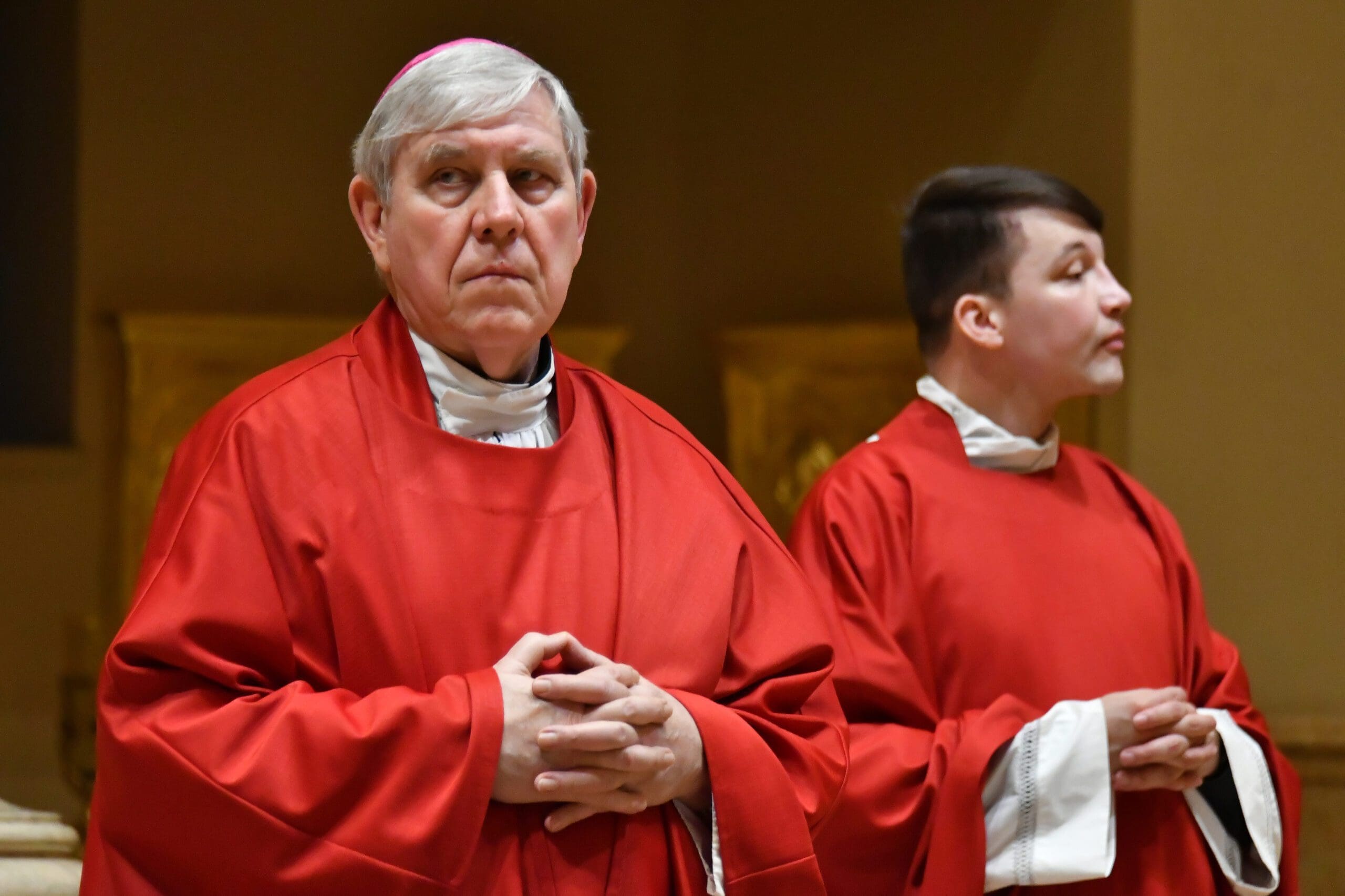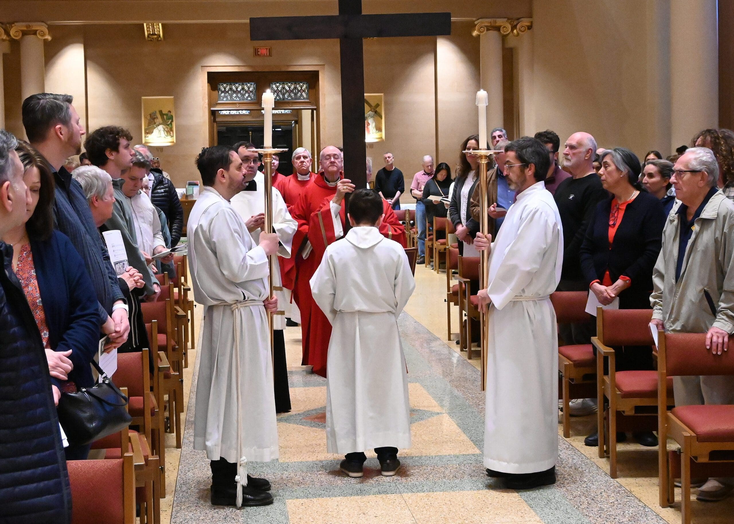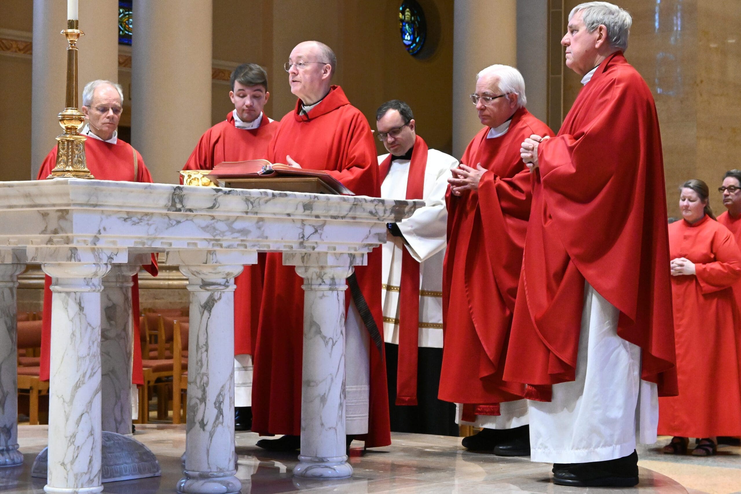 Archbishop Jeffrey S. Grob offers Veneration of the Cross to the faithful attending the Celebration of the Passion of the Lord service on Good Friday, April 18, at the Cathedral of St. John the Evangelist, Milwaukee. (Photos by David Bernacchi)