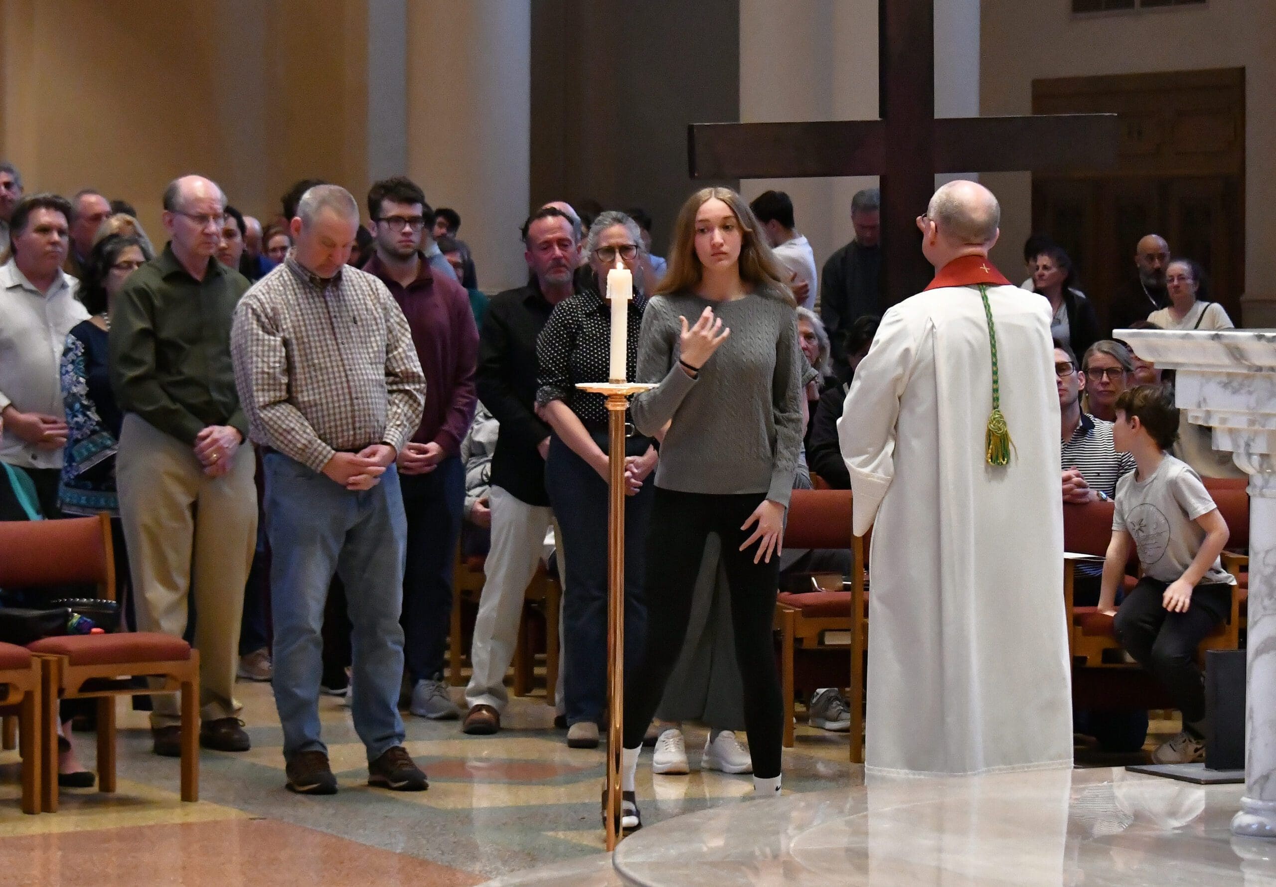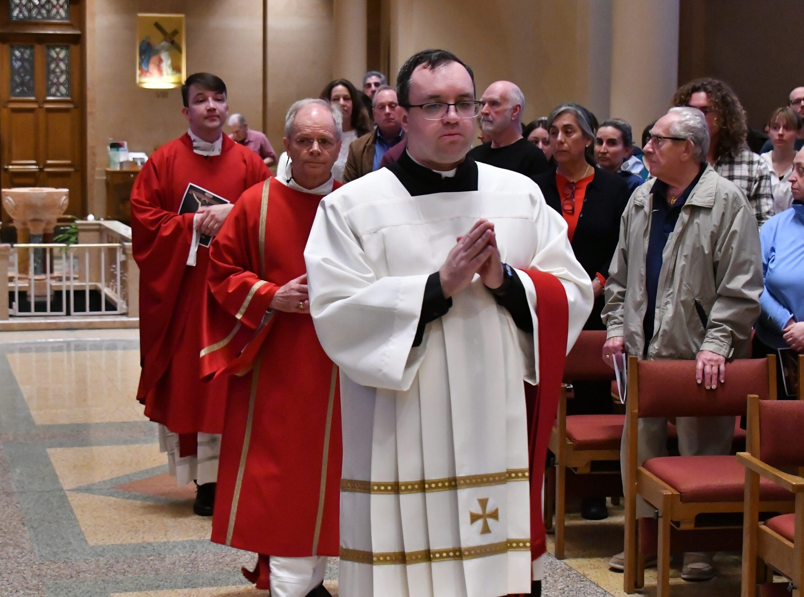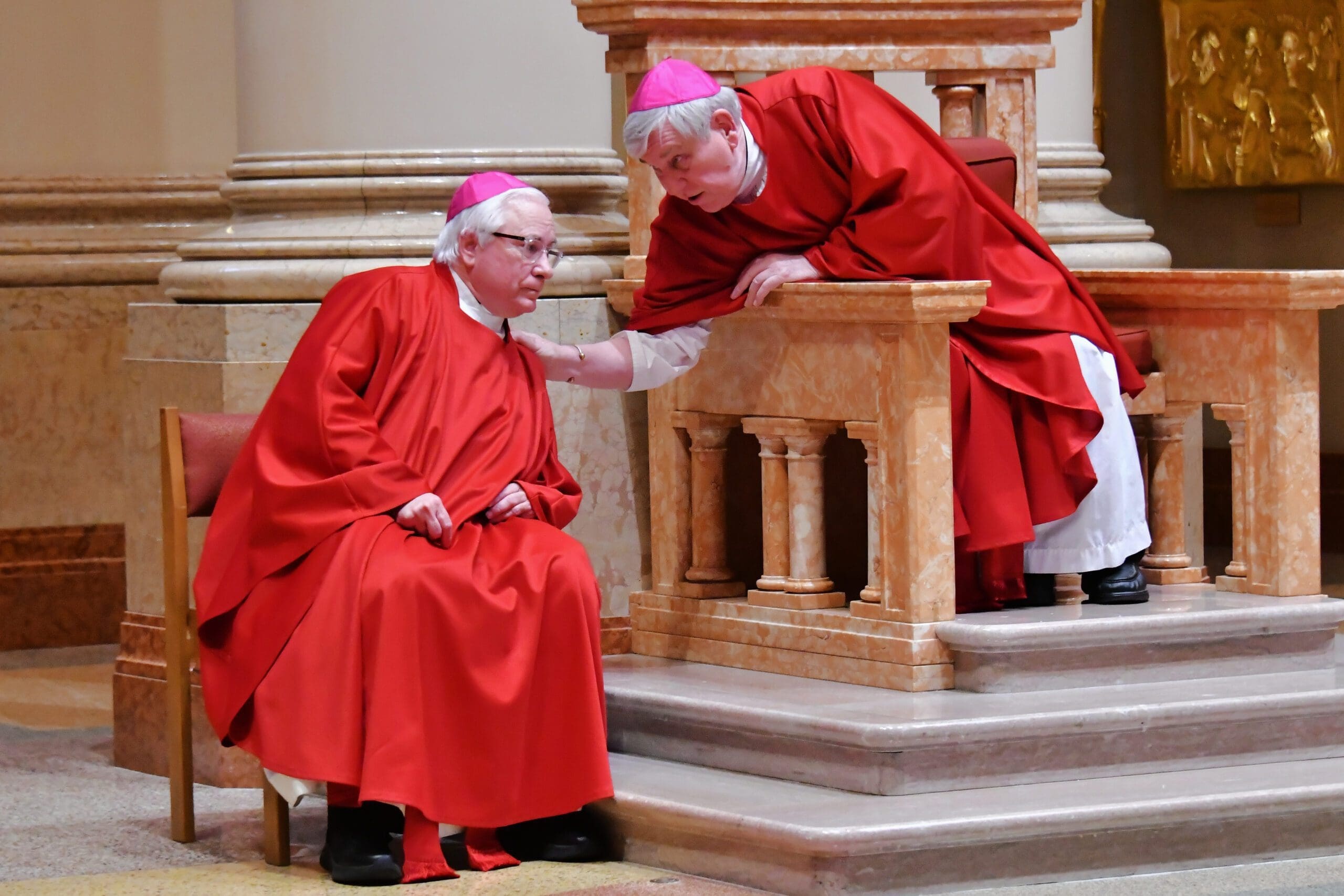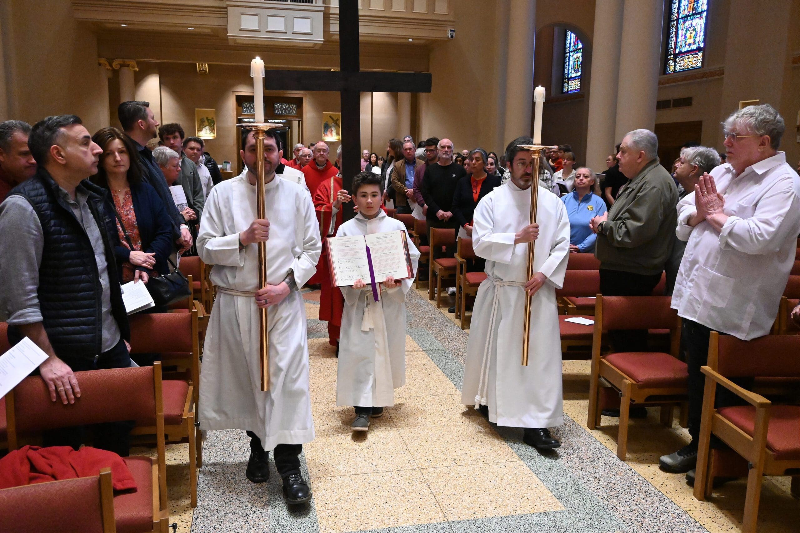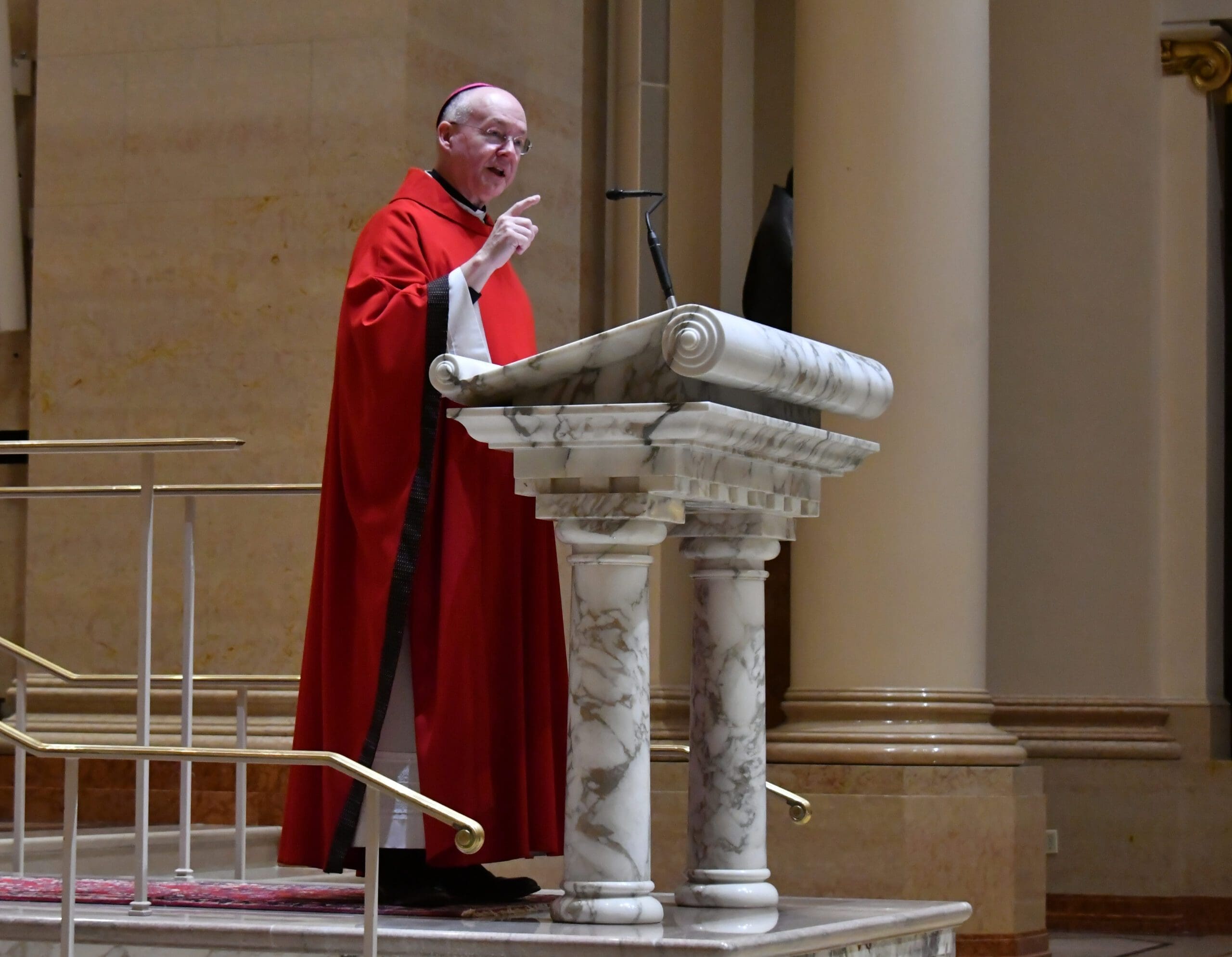 Archbishop Jeffrey S. Grob offers Veneration of the Cross to the faithful attending the Celebration of the Passion of the Lord service on Good Friday, April 18, at the Cathedral of St. John the Evangelist, Milwaukee. (Photos by David Bernacchi)