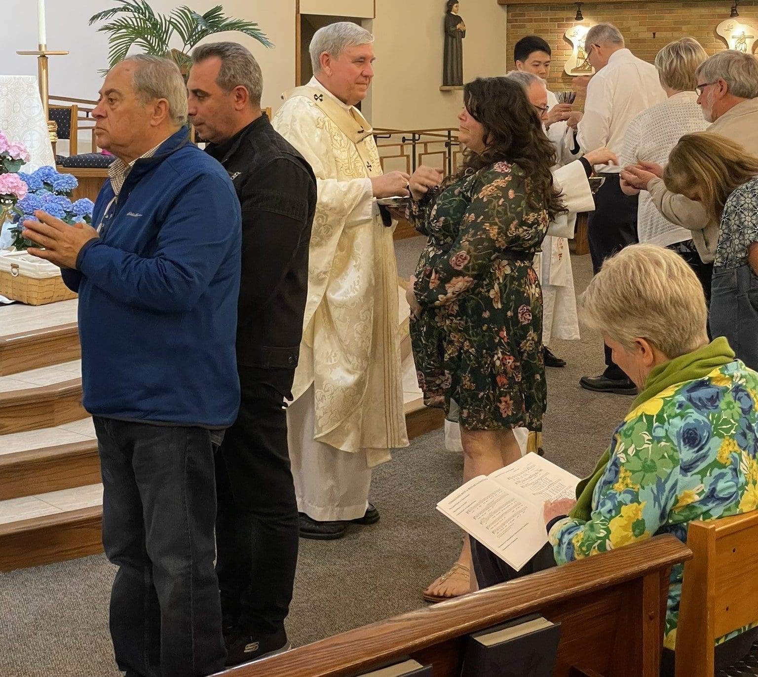 Archbishop Jerome E. Listecki distributes communion during the first of six Masses of Thanksgiving on Tuesday, April 9, at St. Robert Bellarmine in Union Grove. (Photo by Jenni Oliva)