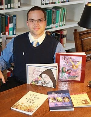 Edward Looney, a seminarian for the Diocese of Green Bay, displays his five books, including his most recent, “Breakfast in Bethlehem,” a children’s book that tells the story of the first Christmas. (Submitted photo by Ryan Rojo)