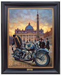 When asked to paint the commemorative postcard for the Rome Harley reunion, June 13-16, Uhl again sought to create that timeless look. His preliminary sketches included a Harley, positioned in the Eternal City. In one, a Vatican official was standing with an old-style camera photographing a bike and in a second, Uhl said he included a cliché-type image of a white dove landing on the Harley handlebars.