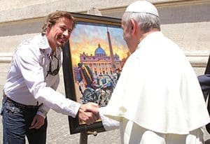 “Essentially, I was so humbled being there. For an artist, Rome is intimidating, as you’re in the presence of Michelangelo. I was overwhelmed and felt a little like the Little Drummer Boy, as I presented the tiniest gift, but on behalf of the motorcycle company and myself, I present this painting,” he said, explaining these were the words he used as presented the image to the pope.