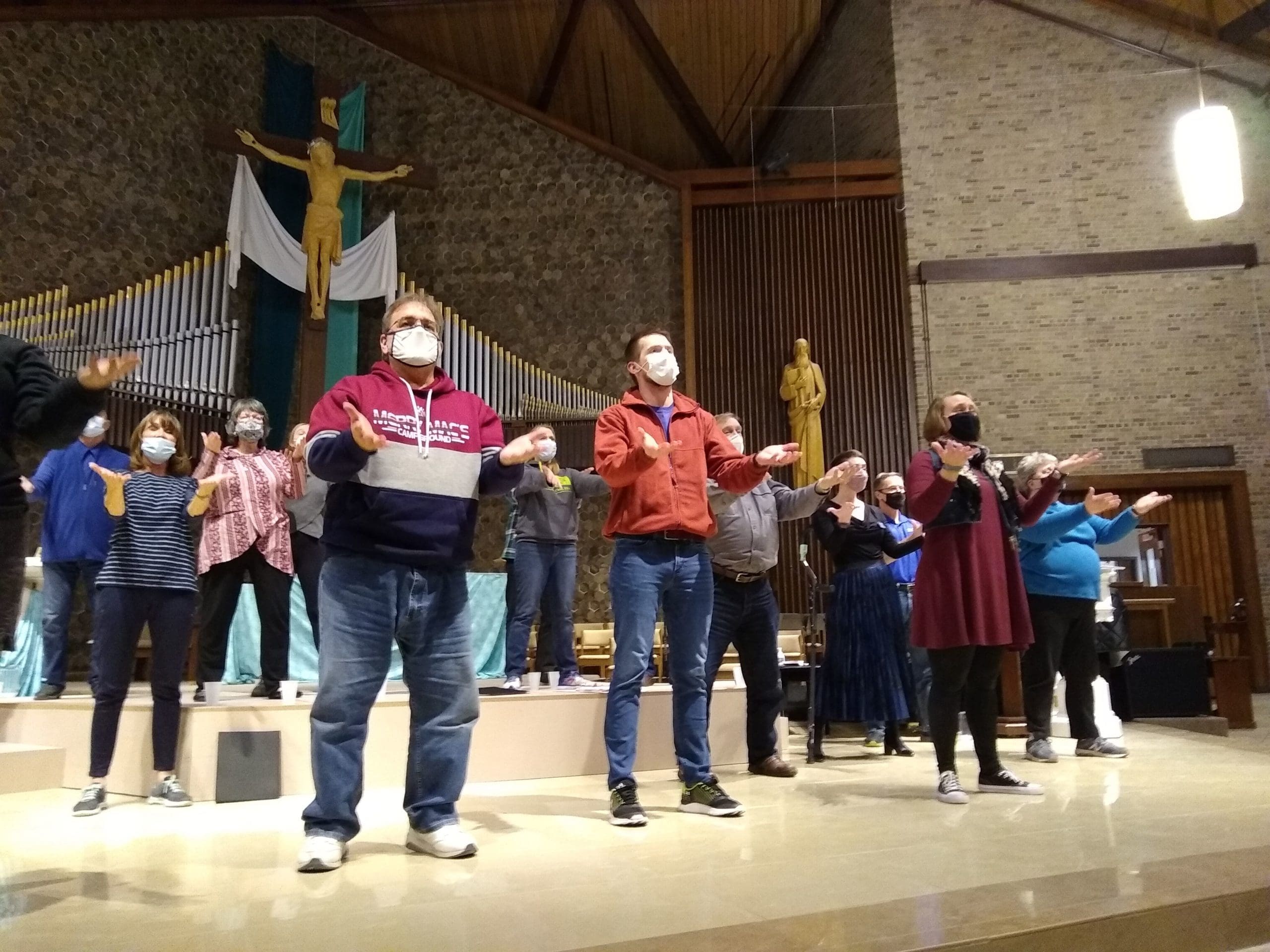 The full ensemble and leads for “Full of Grace” practice their choreography for “Let Your Love Flow,” the song at the wedding feast in Cana. (Submitted photo)