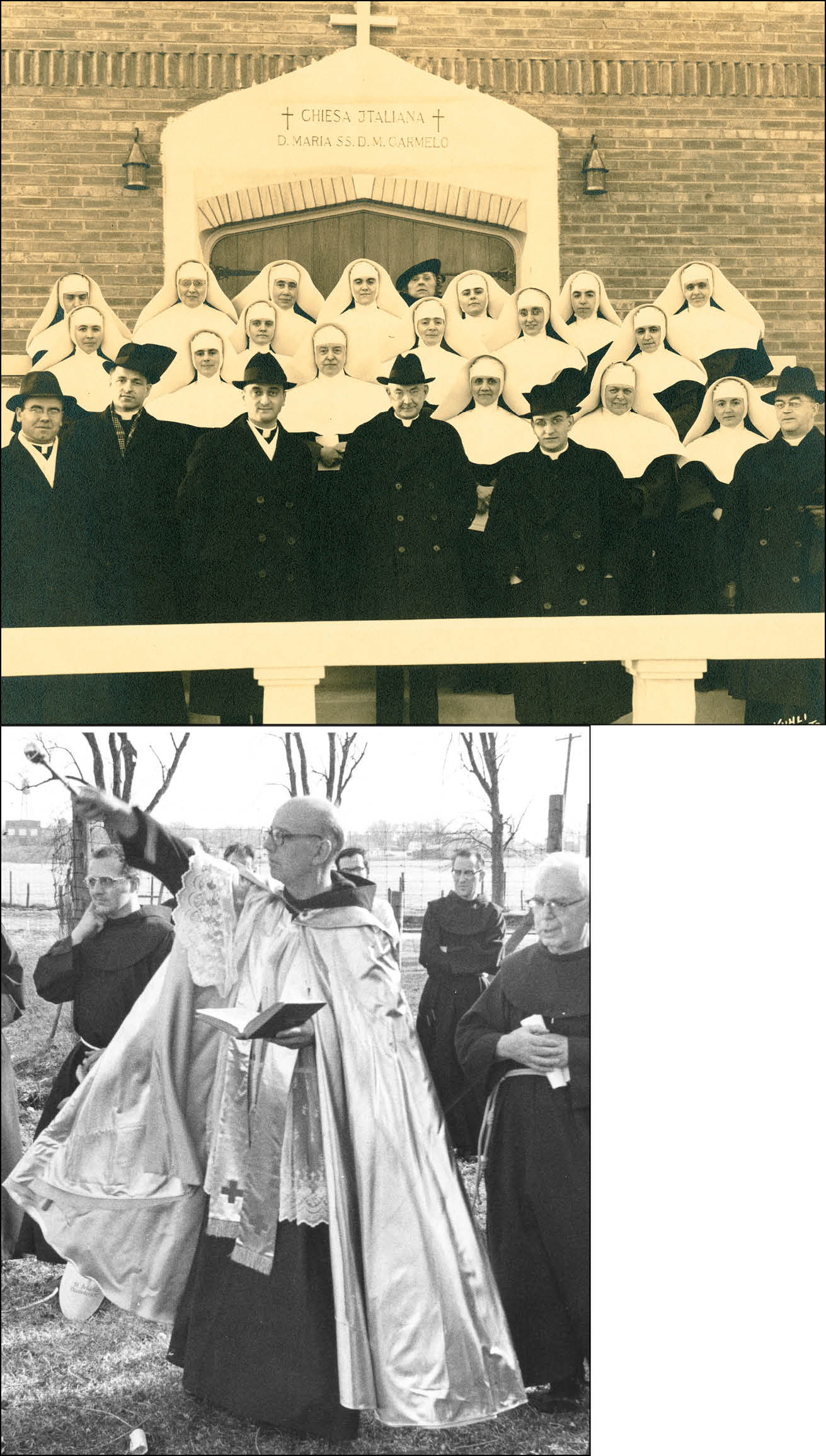 Above: Archbishop Samuel Stritch stands with priests and Sisters of St. Joan Antida outside of the Italian church Our Lady of Mt. Carmel in West Allis. Below: Fr. Theodore Zaremba, OFM, provincial of Franciscans staffing St. Bonaventure prep school, Sturtevant, blessed the site for a new facility at a groundbreaking ceremony.