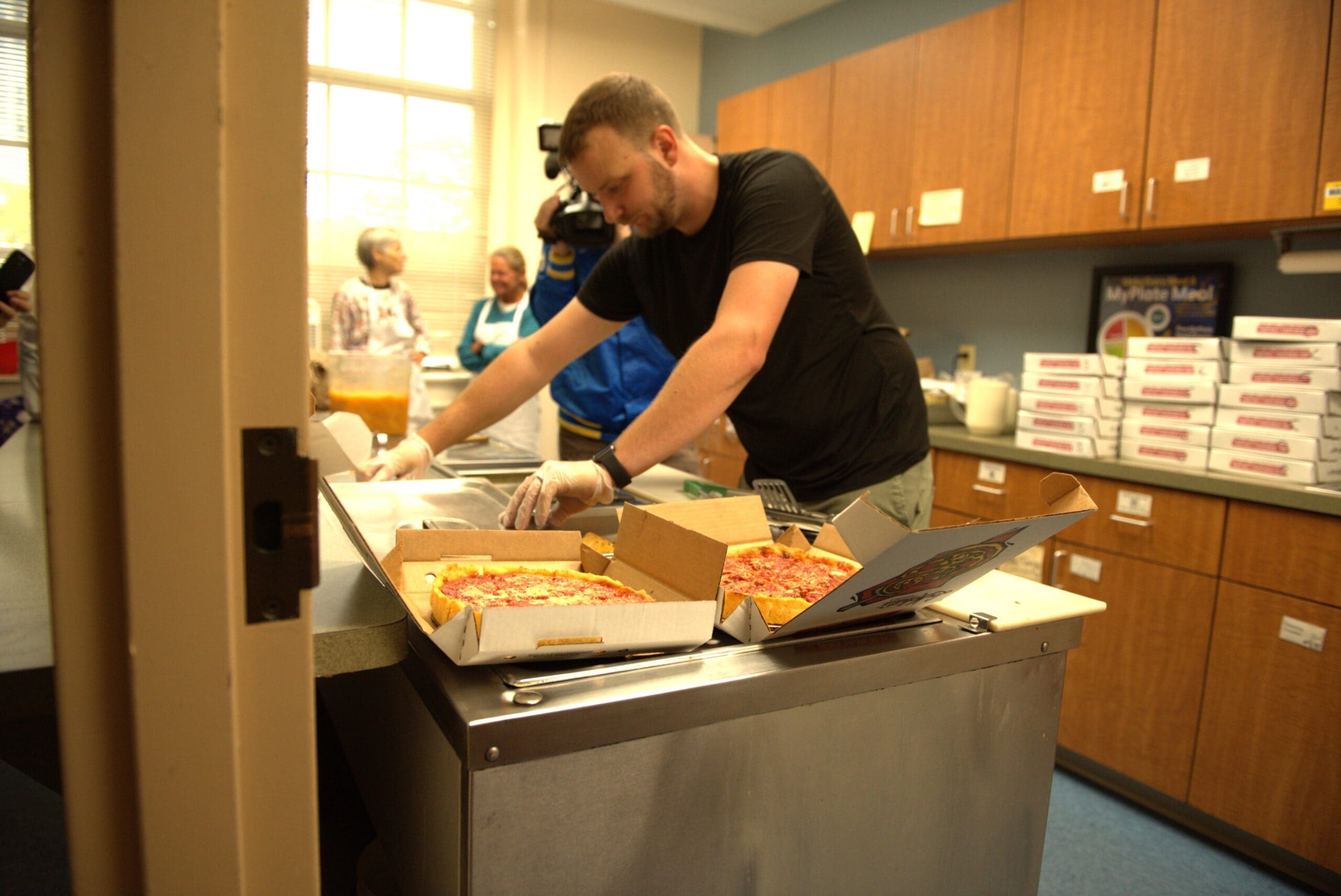 A server sets up Chicago-style pizza from the Windy City’s Lou Malnati’s Pizzeria to be part of the Oct. 13 lunch at the Open Door Cafe meal program offered by the Cathedral of St. John the Evangelist, Milwaukee. (Photo by Steve Sweeney)
